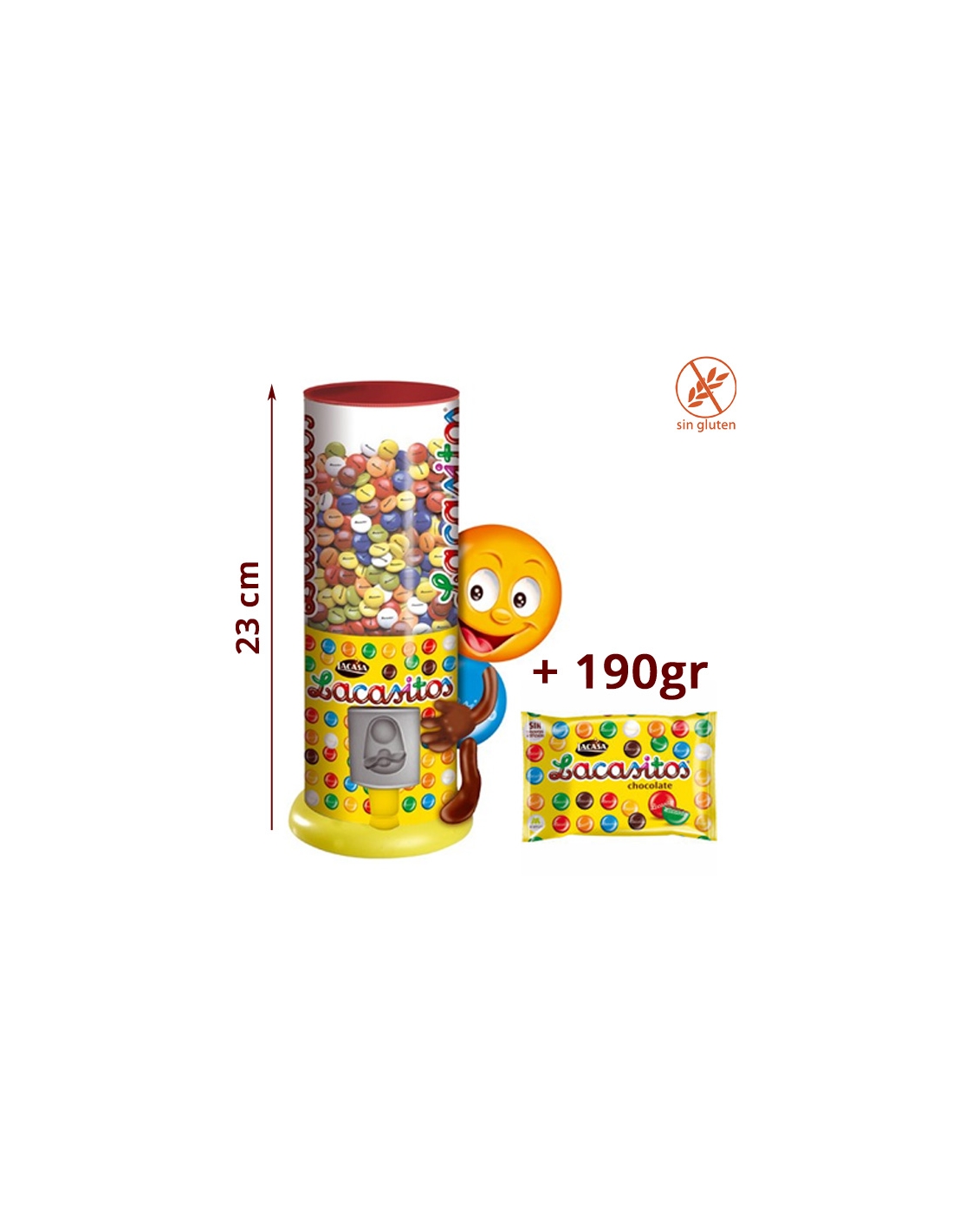 DISPENSADOR LACASITOS es un dispensador de Lacasitos con una Bolsa de 190gr de Lacasitos. Son 23cm de alto y 10cm de ancho del tubo, el muñeco es de plástico.