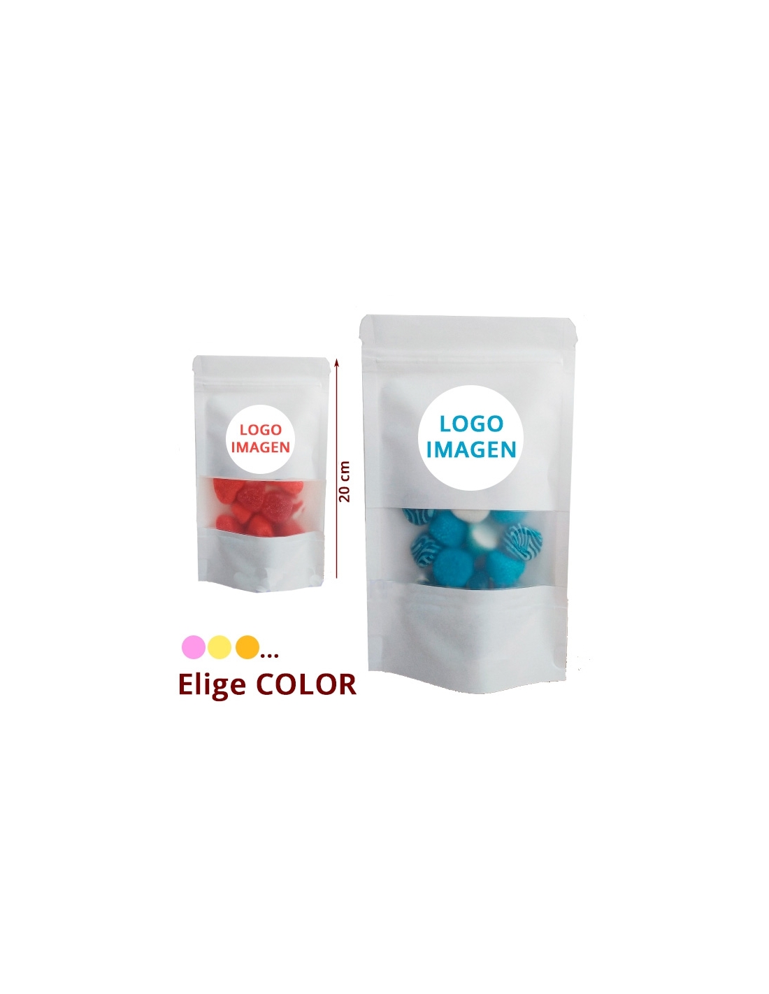 BOLSA CARTÓN BLANCO CHUCHES COLOR 100gr personalizada es una bolsa de cartón blanco satinado con una fina lámina de plástico reciclable en el interior. Sólo debes escoger el color y adjuntar la imagen para la etiqueta de 5cm