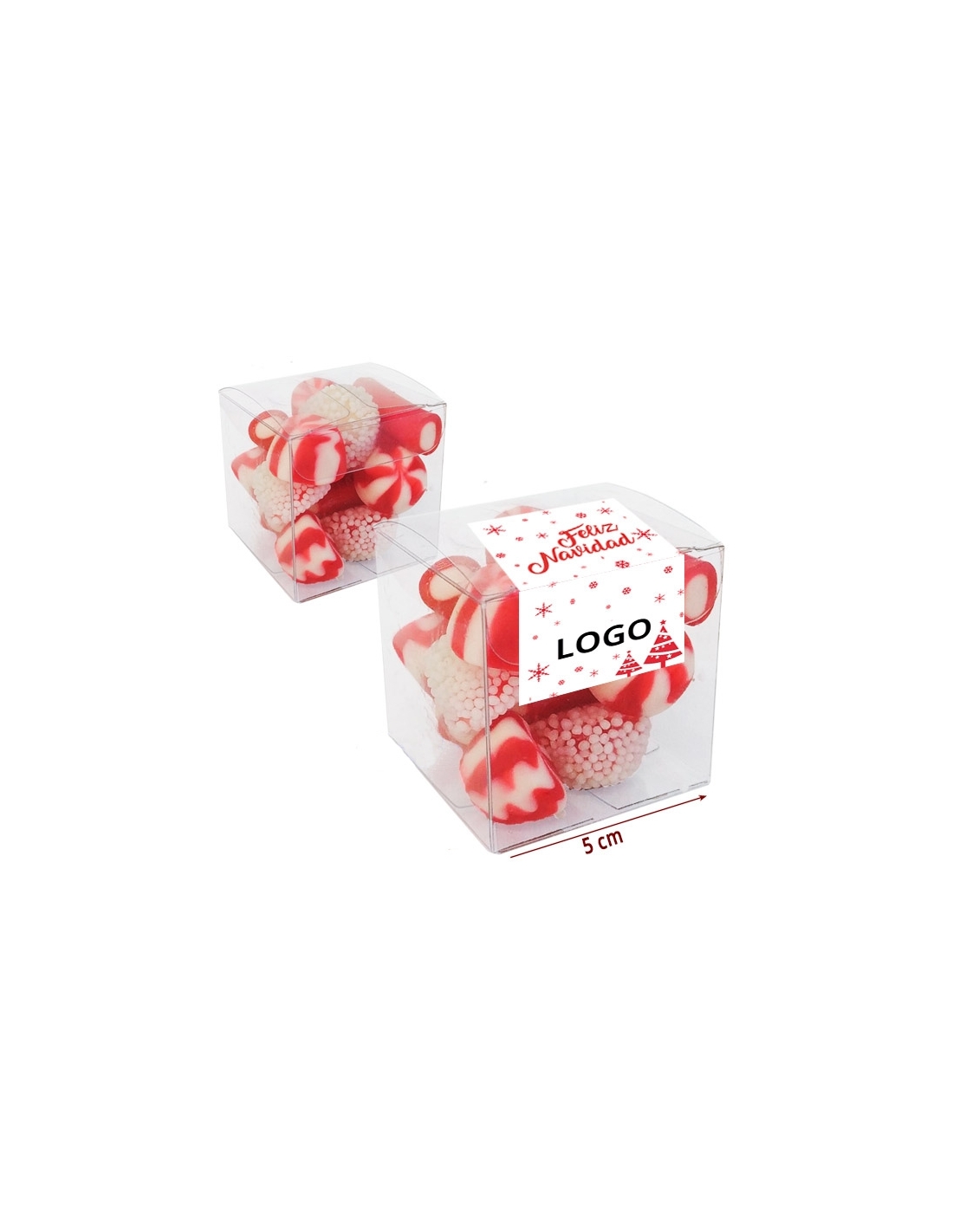 CAJAS CHUCHES NAVIDAD 85gr personalizado son cajas de pvc transparente de 5x5x5cm con 70gr de chuches Navidad.