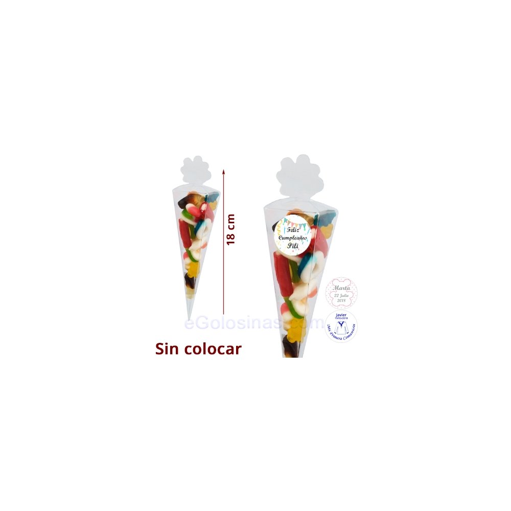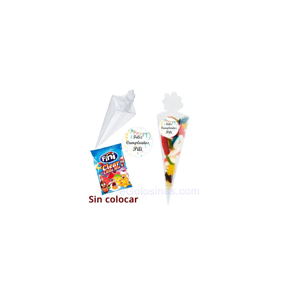 CONO MINI CHUCHES BRILLO SURTIDAS 50gr con ETIQUETA. Es un pack con un cono de 15cm, una bolsita de 100gr de chuches surtidas de FINI para 2 conos de 50gr y una etiqueta redonda de 31mm. ES el regalo perfecto como detalle personalizado para un Cumpleaños u otro evento como Boda, Bautizos y Comuniones.