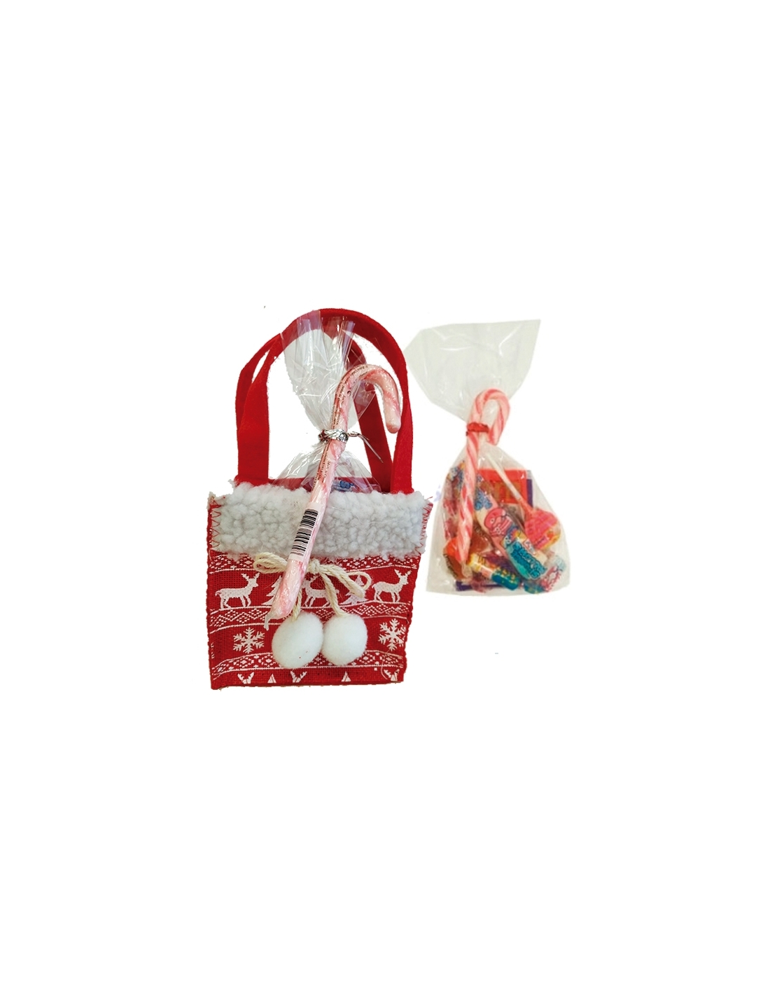 Es un BOLSA en fieltro con CHUCHES surtidas y un BASTON de caramelo de 14gr. La bolsa de Papa Noel mide 11cm de ancho, 6.5cm de largo y 25cm de alto con la asas.