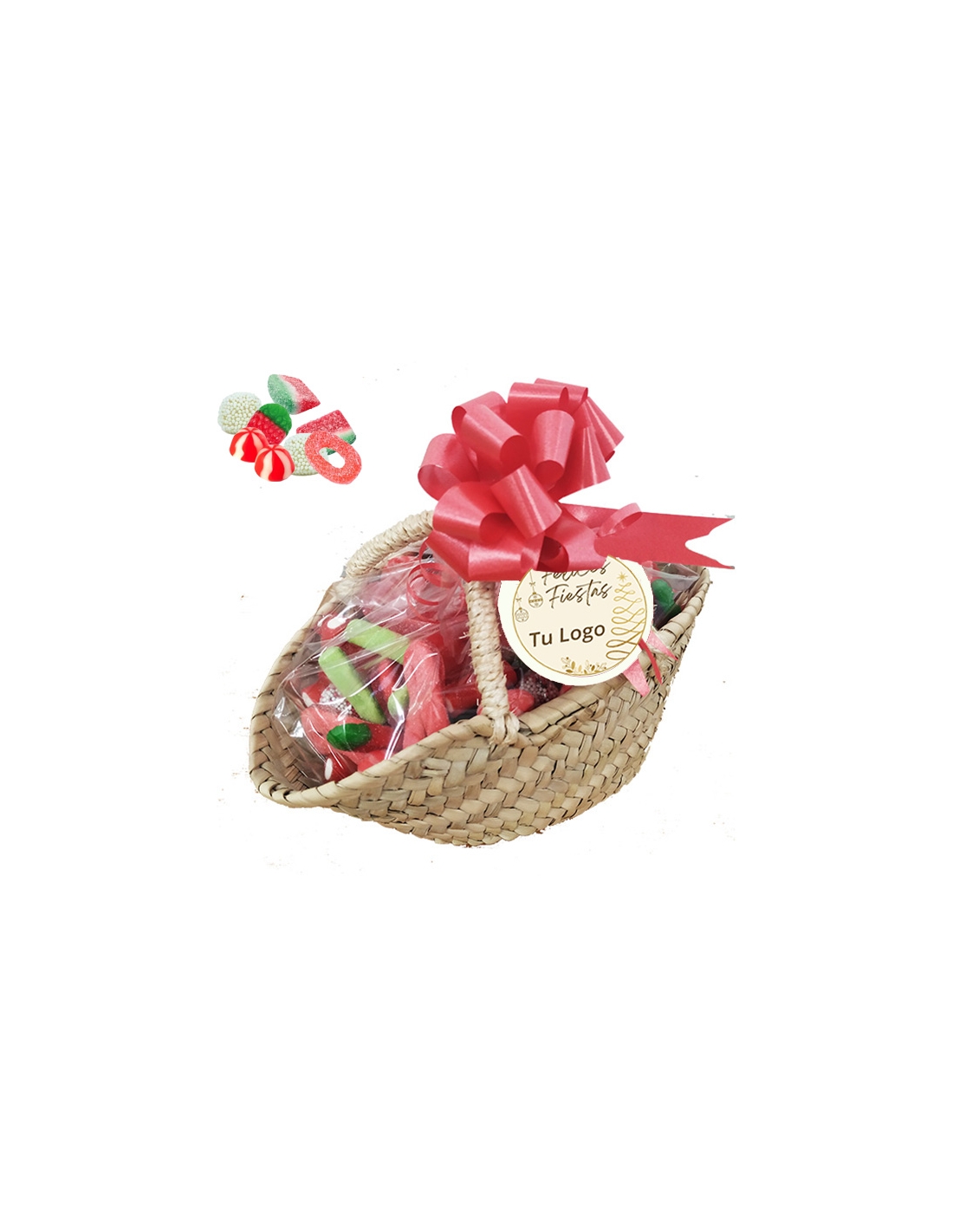 Cesto Grande Mimbre 700Gr Chuches Navidad Personalizable es un cesto de mimbre de 23cm de alto con asas y 850gr de golosinas surtidas en tonos navideños.
