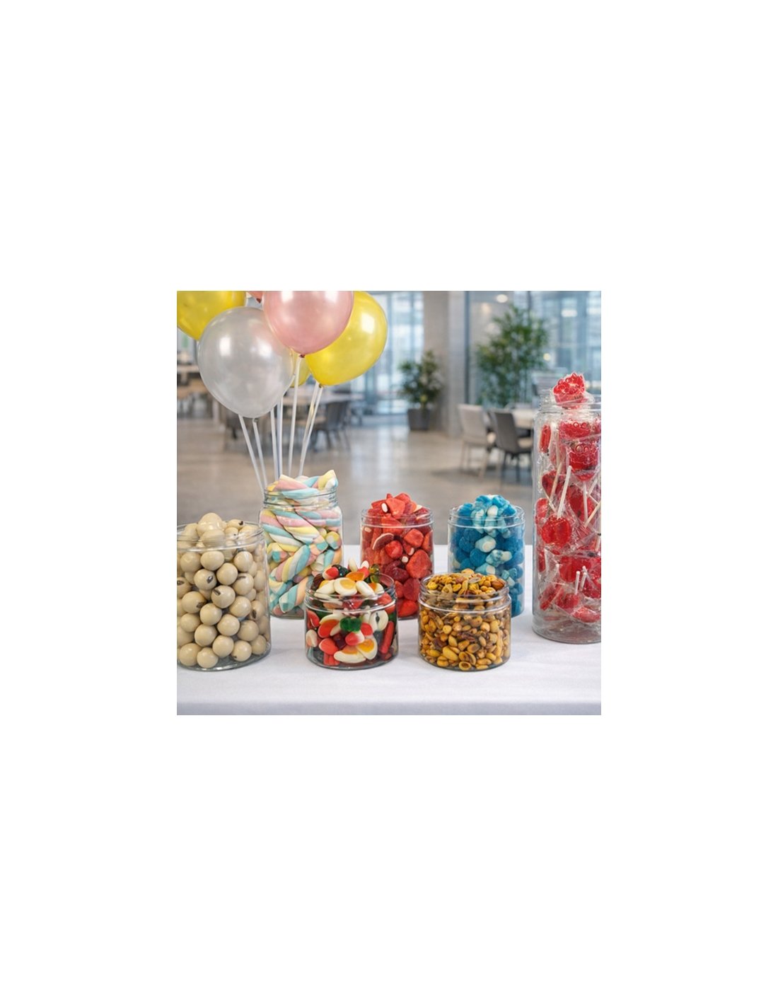 CANDY BAR CELEBRACION FIESTA 5Kgs aprox Es una mesa de chuches decorada con golosinas. Contiene 7 tarros LLENOS y cerrados, 2 750gr distintos sabores azul y rosa,1 tarro chuches brillo 500 gr. 1 tarro grande de nubes 35 nubes, 1 tarro alto con 100 piruletas, 1 Tarro con 500 gr.de Chocobolas blanca, 1 tarro de frutos secos mix sin cascara fritos salados. La decoración COMPLETA:Soporte de globos sobremesa con 8 globos tonos pastel.
