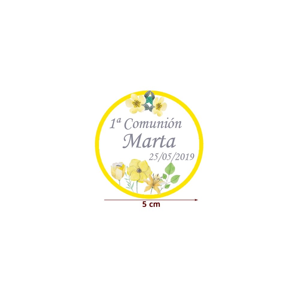 Etiqueta Pegatina Comunión Amarillo Flores Personalizada 5cm