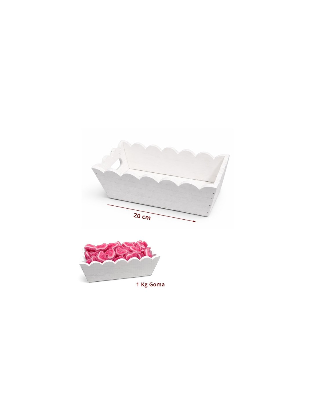 Caja rectangular de madera blanca de 20x9 cm ideal para mesa dulce. Capacidad aproximada de 1 kg de chuches o golosinas. Perfecta para candy bar, eventos y presentaciones profesionales. Permite crear altura y organización en mesas dulces combinándola con otros formatos.