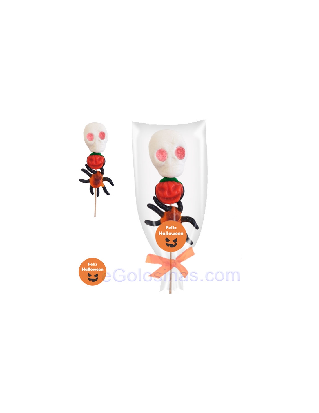 Es un pincho con chuches con temática de halloween: negro y naranja, con forma de calabazas, calaveras y bichos. Ideal para fiestas infantiles de Halloween o Noche de los muertos.