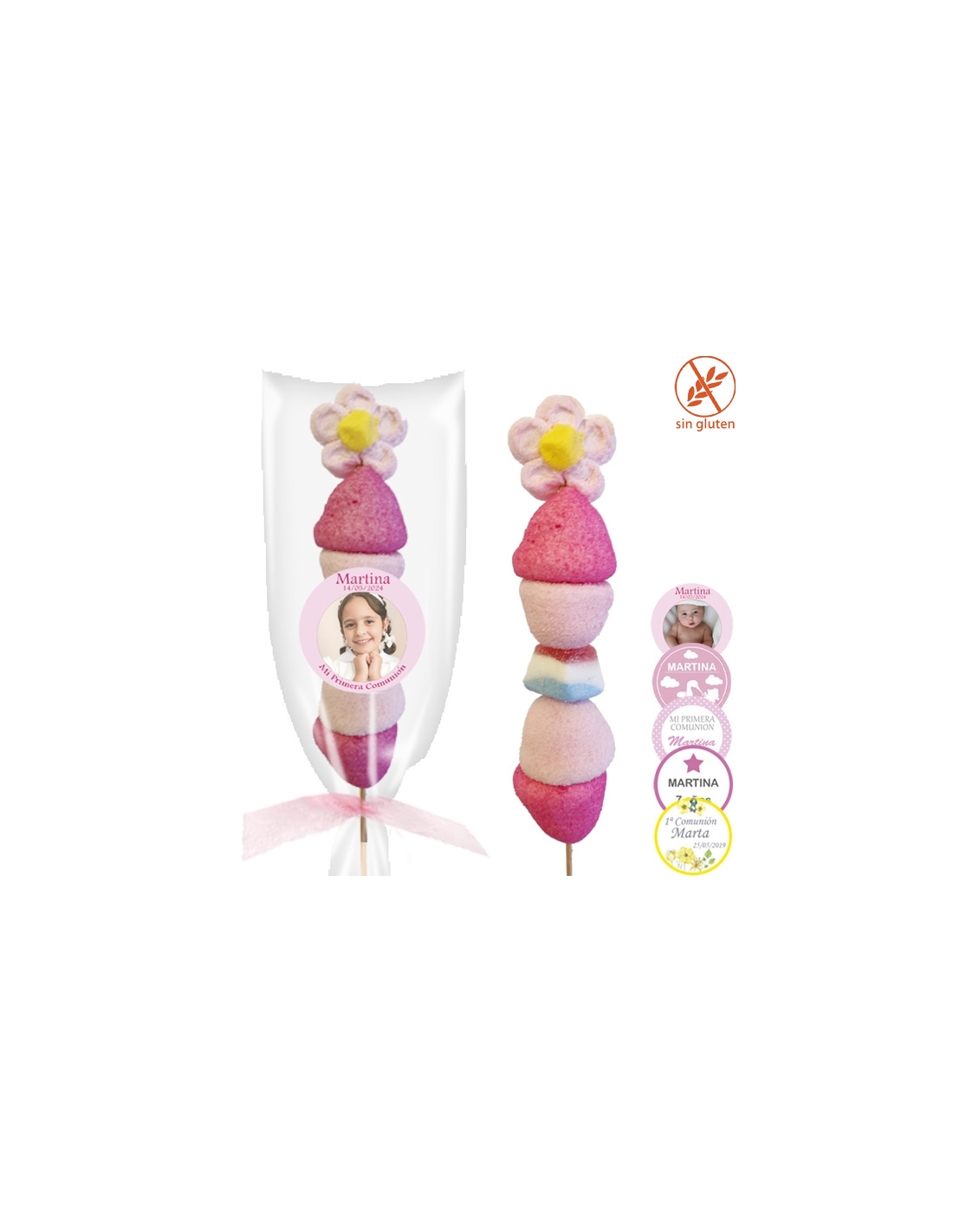 .Comprar Brocheta de chuches rosa personalizada para Comunión, Bautizo o cumpleaños
