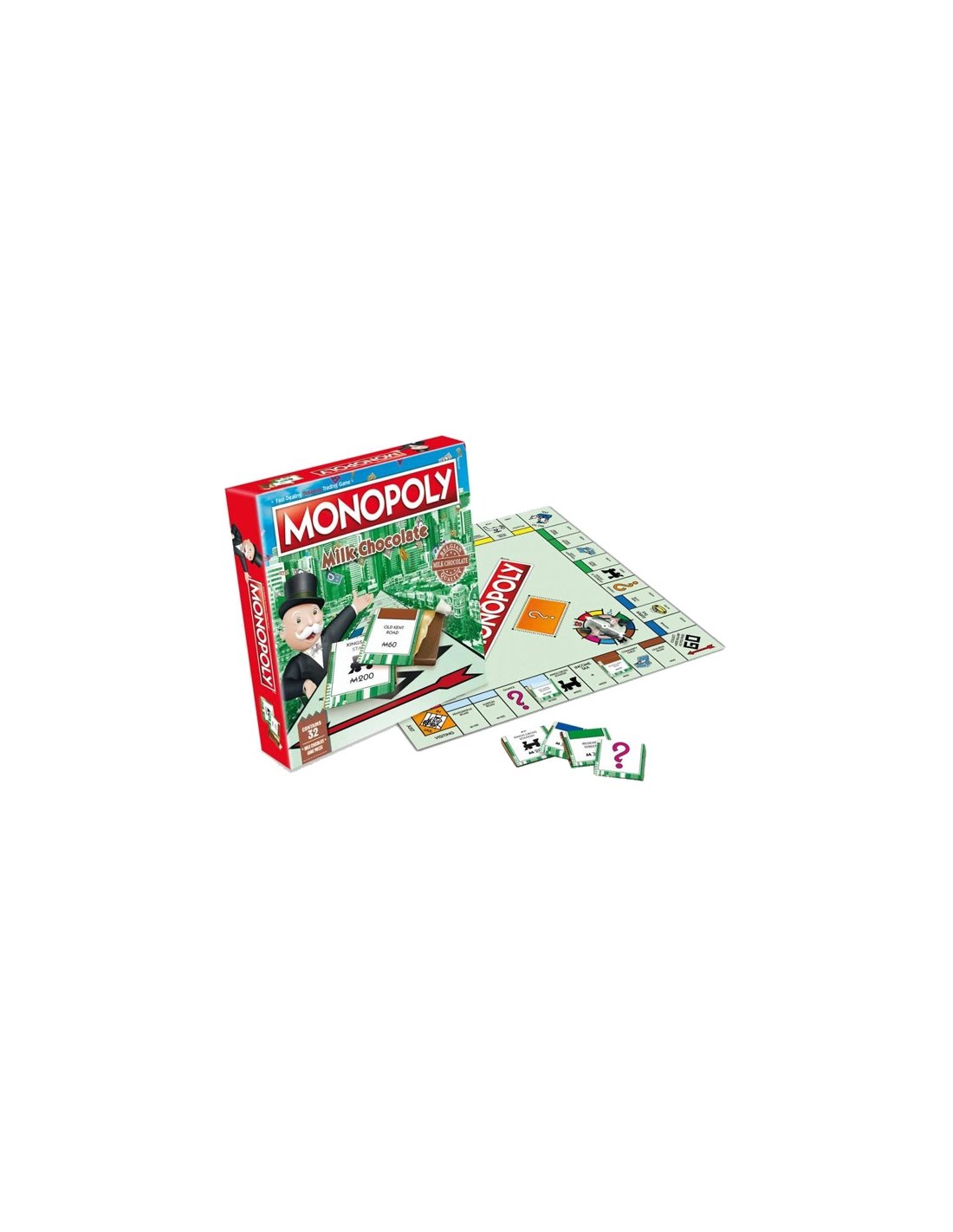 Caja de bombones Juego Monopoly 108gr contiene el juego del Monopoly adaptado; tablero de juego, una ruleta y napolitanas de chocolate con leche, de 108g.