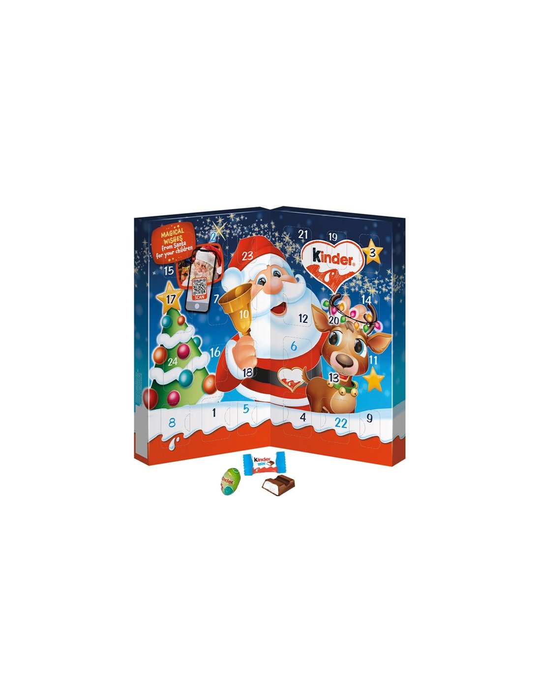 Calendario de Chocolate Kinder Libro Papá Noel 113gr es un calendario de chocolatinas Kinder con: 10x Kinder Mini Eggs Avellanas, 4x Kinder Chocolate Mini Eggs y 10x Kinder Love Mini.