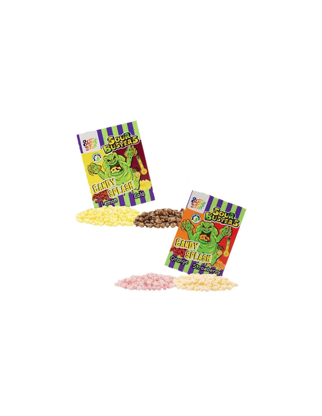 Cajitas caramelos ácidos 2 sabores Sour Buster Candy Splash 45g 16udss son 2 tipos de cajitas con caramelos ácidos: una con cola y limón y la otra con fresa y naranja.