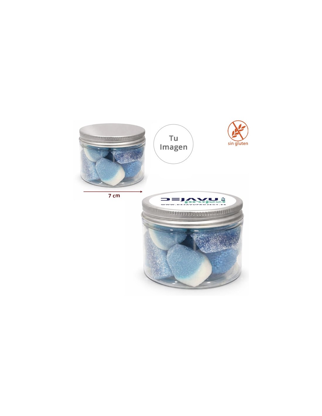 Tarro de chuches azules con logo personalizado para empresas 130g