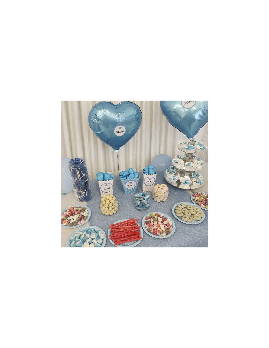 Pack de Mesas Chuches Comunión azul que contiene TODO lo que se ve en la imagen chuches, bols y globos, excepto la cortina y el mantel.
