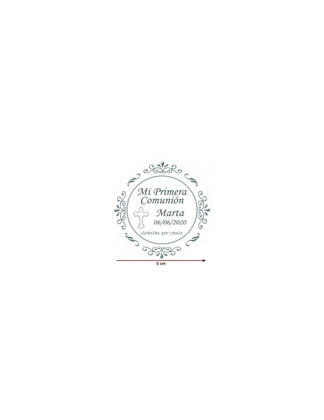 La etiqueta prediseñada en tonos azules aporta un estilo elegante y festivo que encaja perfectamente con celebraciones de Primera Comunión.