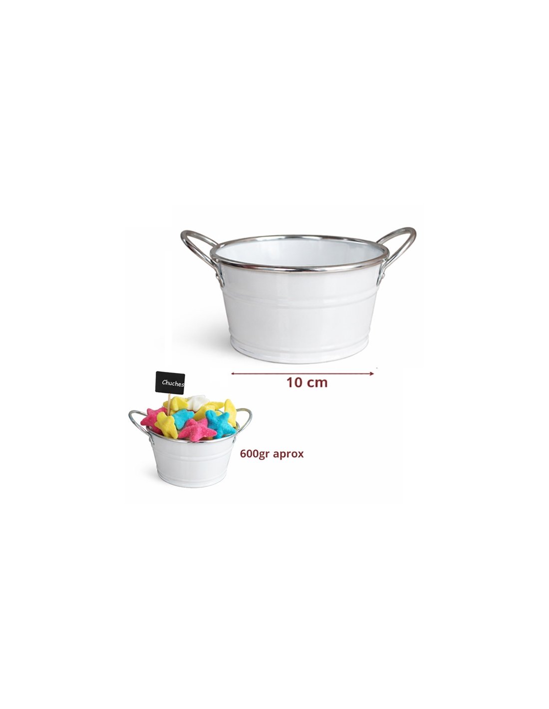 BOL REDONDO METALICO BLANCO CON ASAS 1ud para tu mesa de chuches. Mide 10cm de diámetro aprox y 7.5cm de alto. Cabe 600gr de chuches aprox.