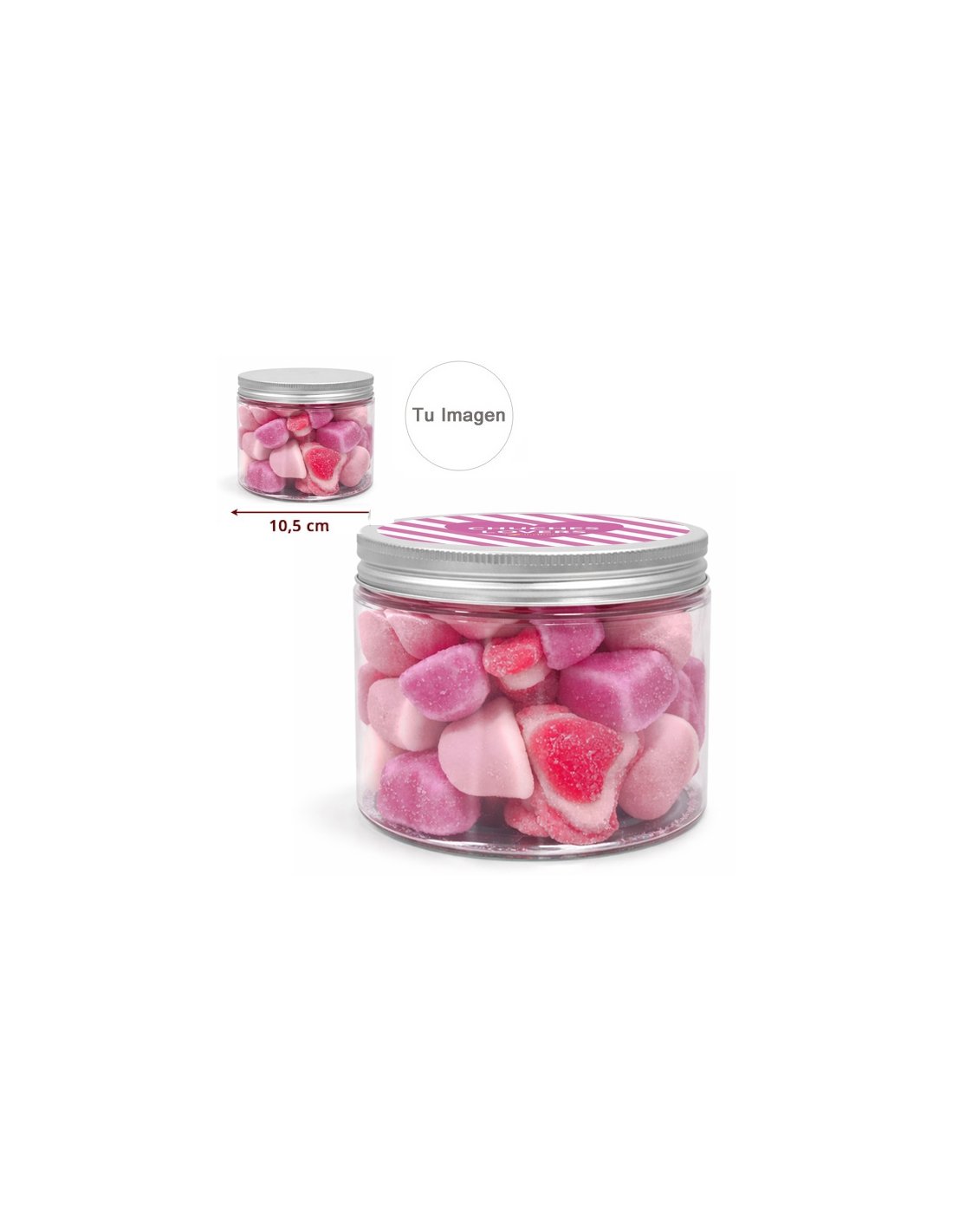 Nuestro tarro de chuches rosas surtidas de 500g es perfecto para quienes buscan un bote de golosinas rosas original y personalizado.