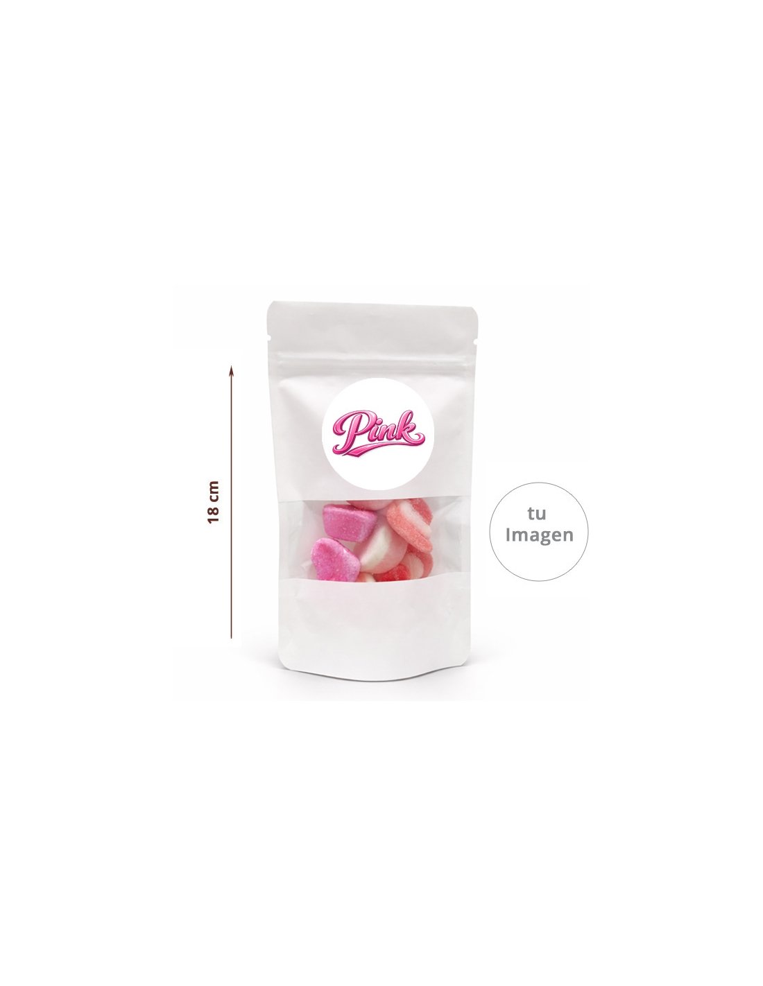 .Comprar Bolsa Blanca con ZIP de chuches rosas 70g personalizada para empresas