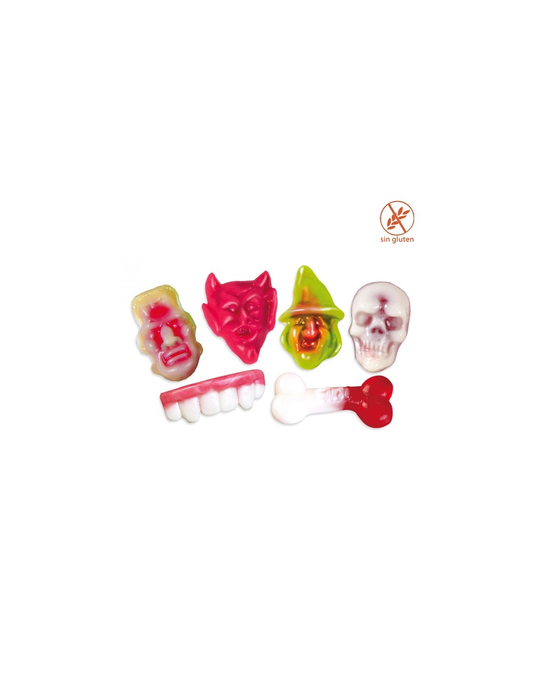 Surtido Chuches Terror Halloween 250uds Fini Golosinas es un surtido de goma brillo de chuches de Halloween con forma de Frankenstein, Drácula, bruja, calavera, huesos y dentaduras.