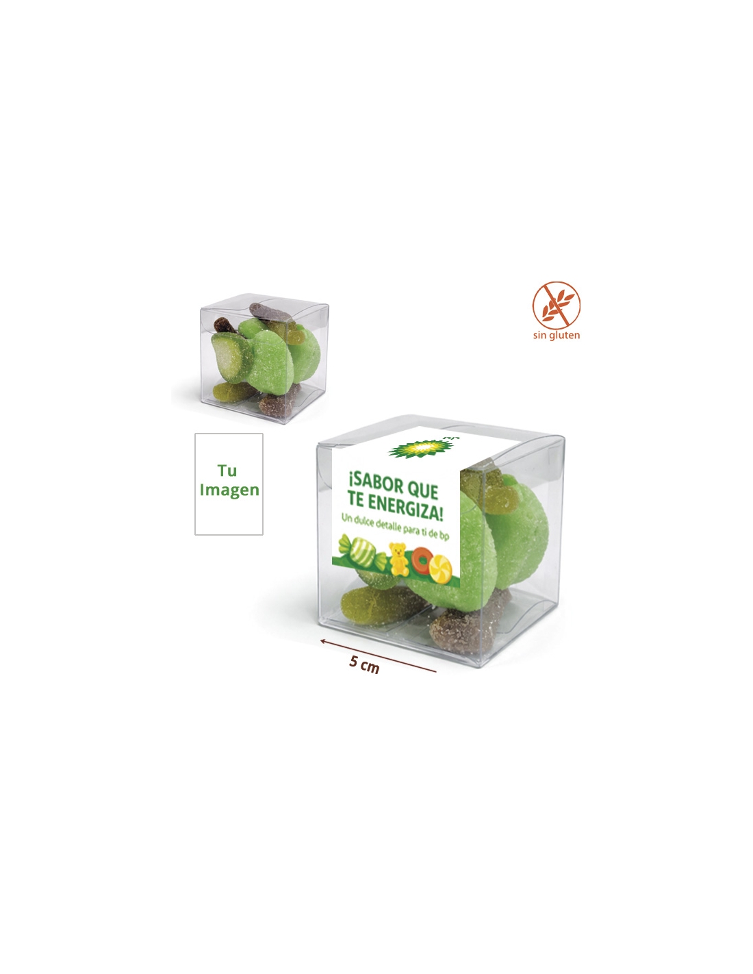 Las cajitas incluyen una selección de gominolas verdes surtidas y pueden personalizarse con el logo de empresa o con el diseño del evento.