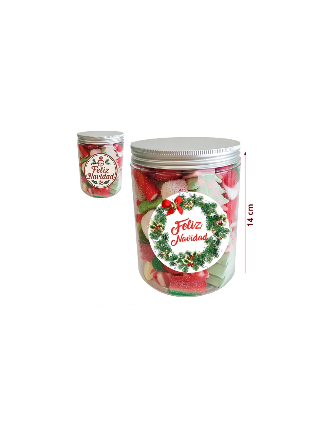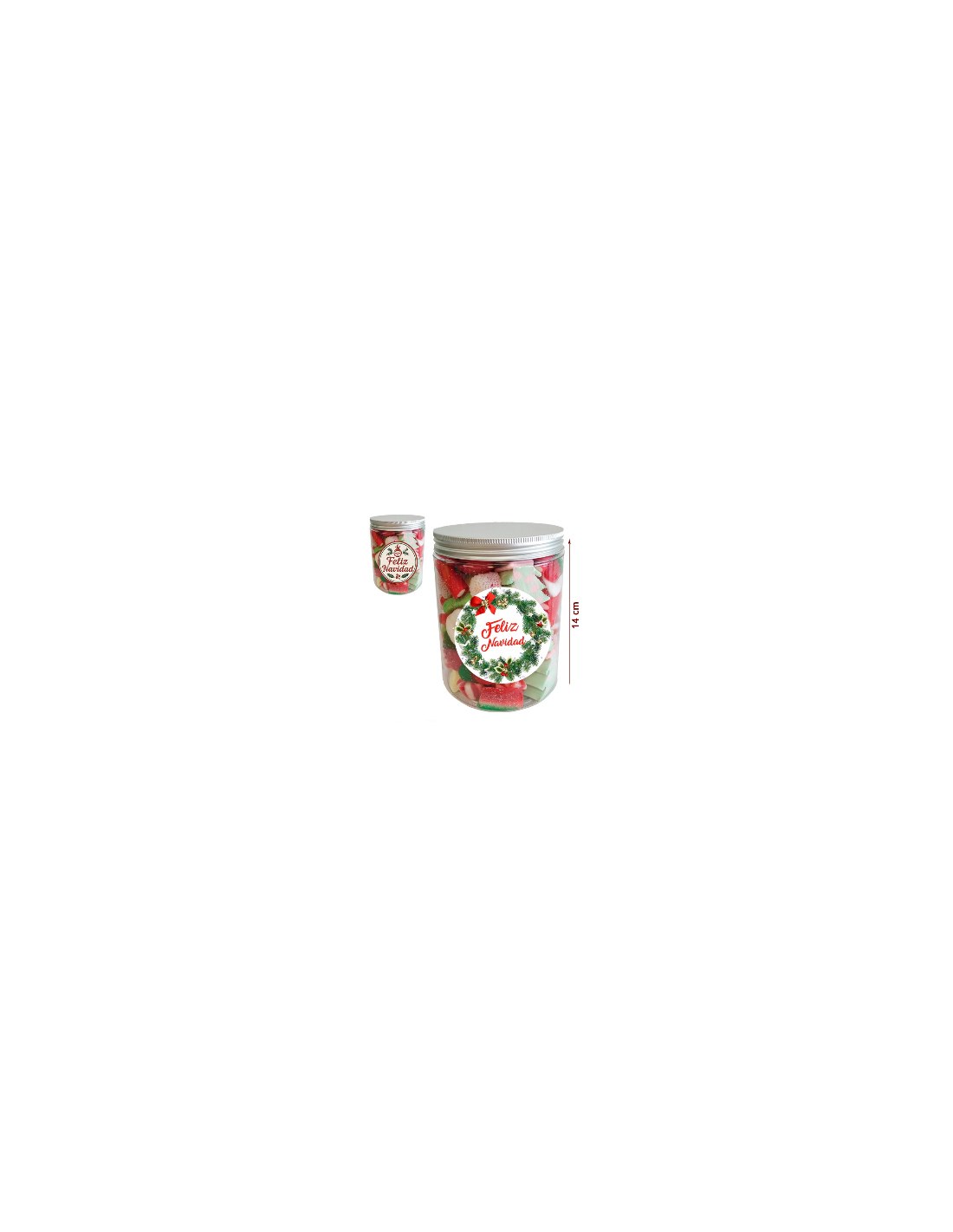 TARRO CHUCHES NAVIDAD 700Gr personalizable es un tarro de plástico pet con tapa plateada y etiqueta frontal de 80mm. Puedes escoger si deseas la etiqueta genérica o con el logo de tu empresa.