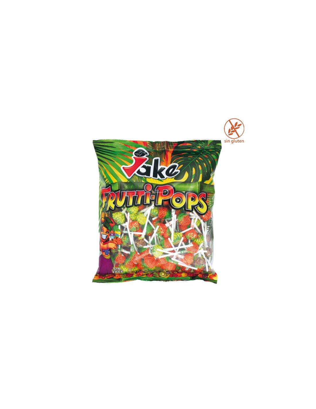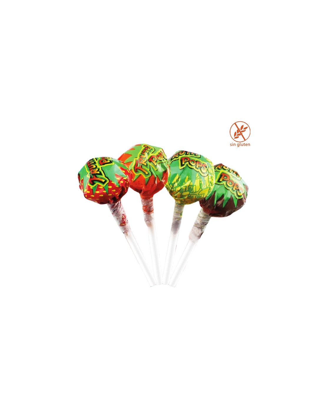 FRUTTI POP es un caramelo con palo de surtido de frutas de fresa, naranja, piña y cola. Se venden en bolsas de 200uds. Sin Gluten
