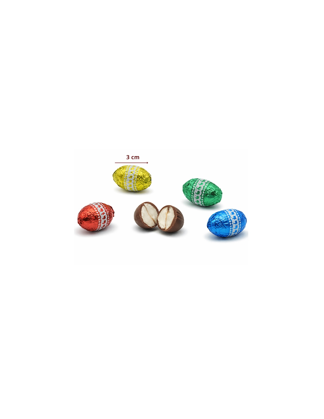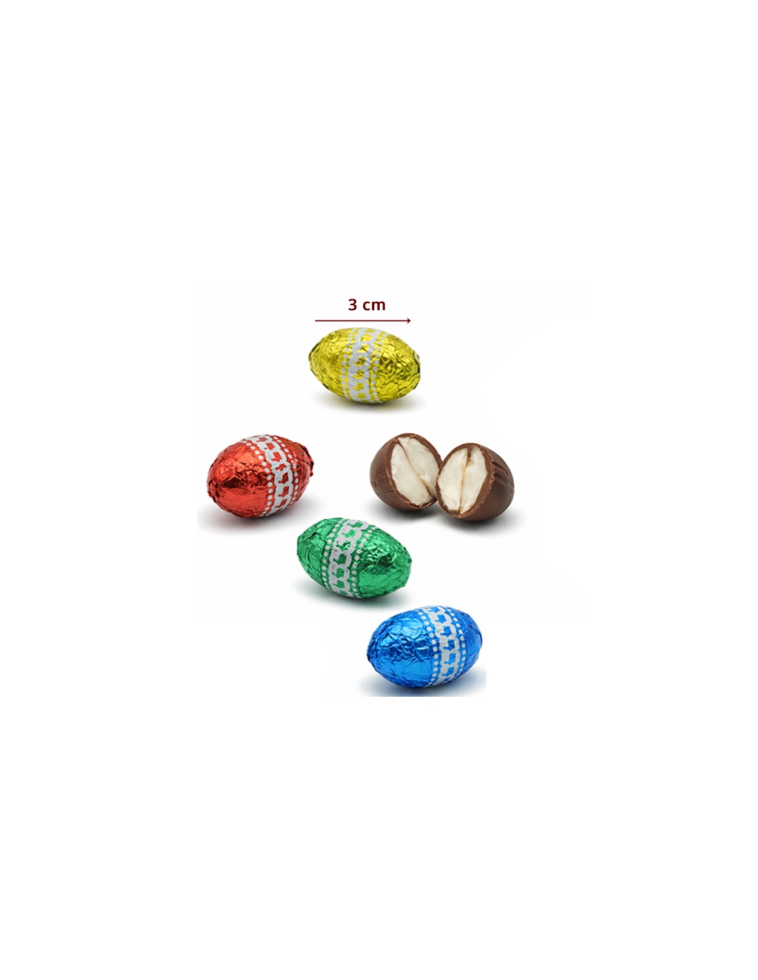 Estos Huevos pequeños de chocolate miden 3cm de largo aprox y 2.5cm de ancho.