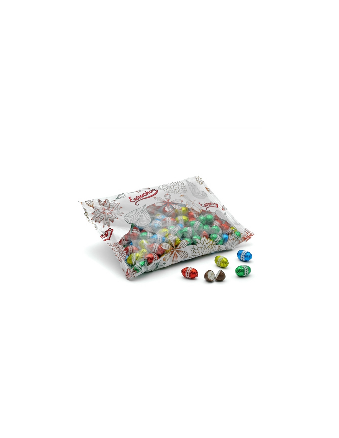 Huevos de Chocolate pequeños 1Kg Eurochoc (175 uds aprox) de chocolate son huevos de chocolate rellenos de crema de avellanas y crema blanca envueltos con papel brillante de 3cm de largo y 2.5 de ancho cm. Se venden en bolsas de 1Kg.. Chocolate a granel envasado directo de fábrica.