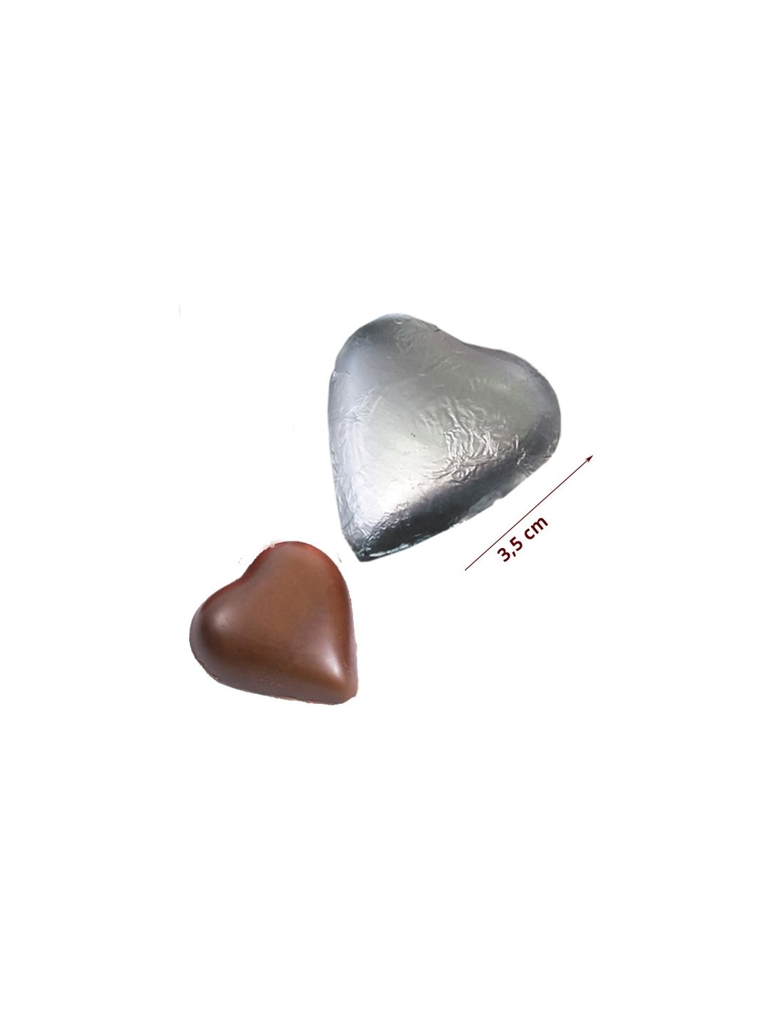 BOMBONES CORAZON PLATA son bombones de chocolate con leche envuelto con papel plata brillante. Se venden en bolsas de 115 unidades de 8,5gr cada bombón. Miden 3.5cm aprox de largo y ancho, y casi 2cm de alto aprox.