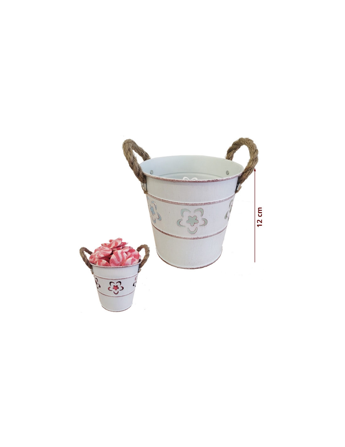CESTO BLANCO CON ASA CUERDA 1ud es un cesto metálico blanco de 12cm de diámetro y 12cm de alto. Ideal Caja de para Mesas Dulces o para colocar tus detalles a los invitados. Crea tu Mesa Dulce con todos los accesorios que encontrarás en esta categoría. Tiene capacidad para 750gr de chuches goma.