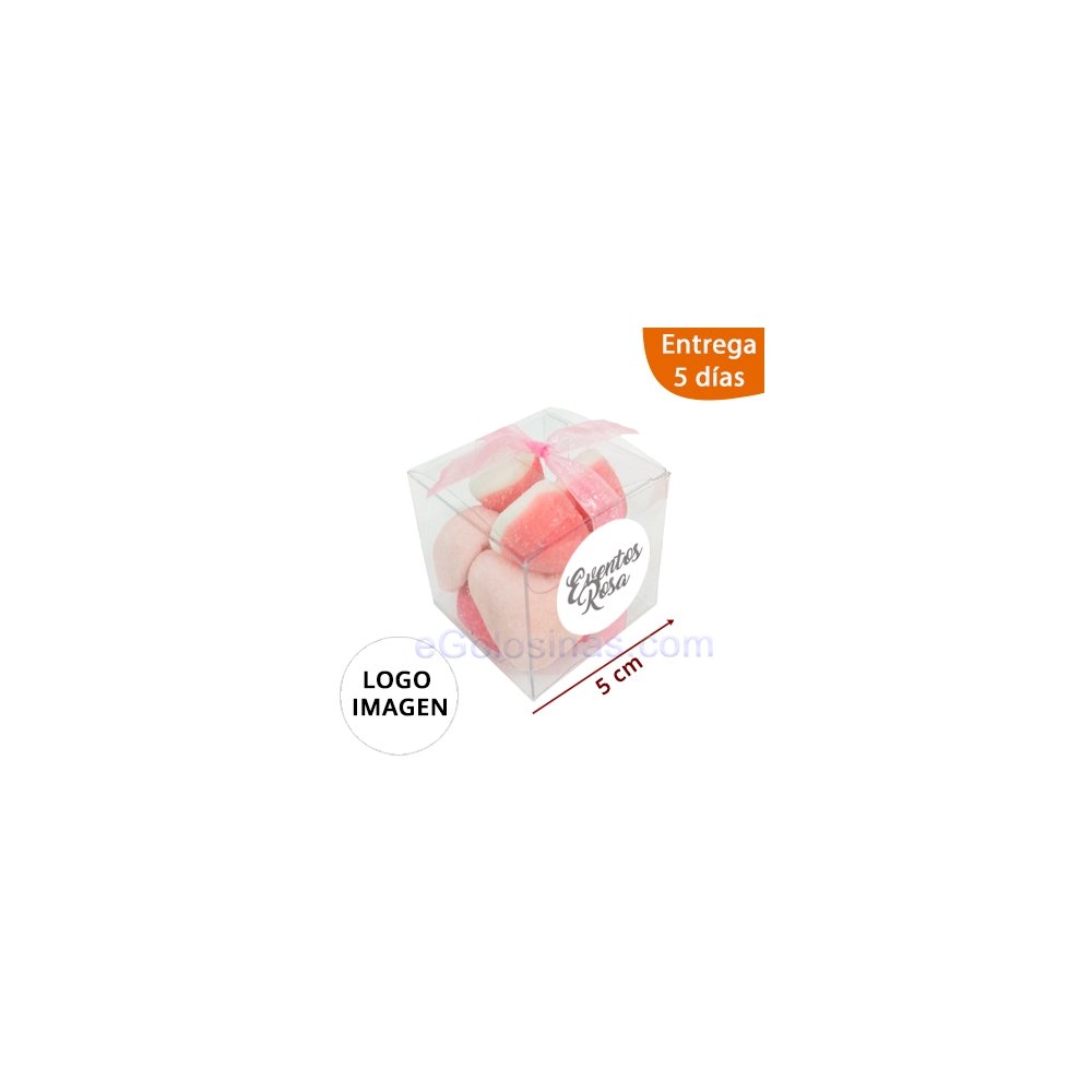 CAJA CHUCHES ROSA 65gr con LOGO personalizado es una caja de pvc de 5x5x5cm con chuches rosa nube y gomas. Cerradas con una cinta naranja. Toda la caja viene montada y etiquetada. La etiqueta mide 31mm de diámetro y sólo deben enviarnos la imagen en JPG en buena resolución a todo color. Son detalles de empresa para eventos, convenciones o un detalle de chuches para los empleados.