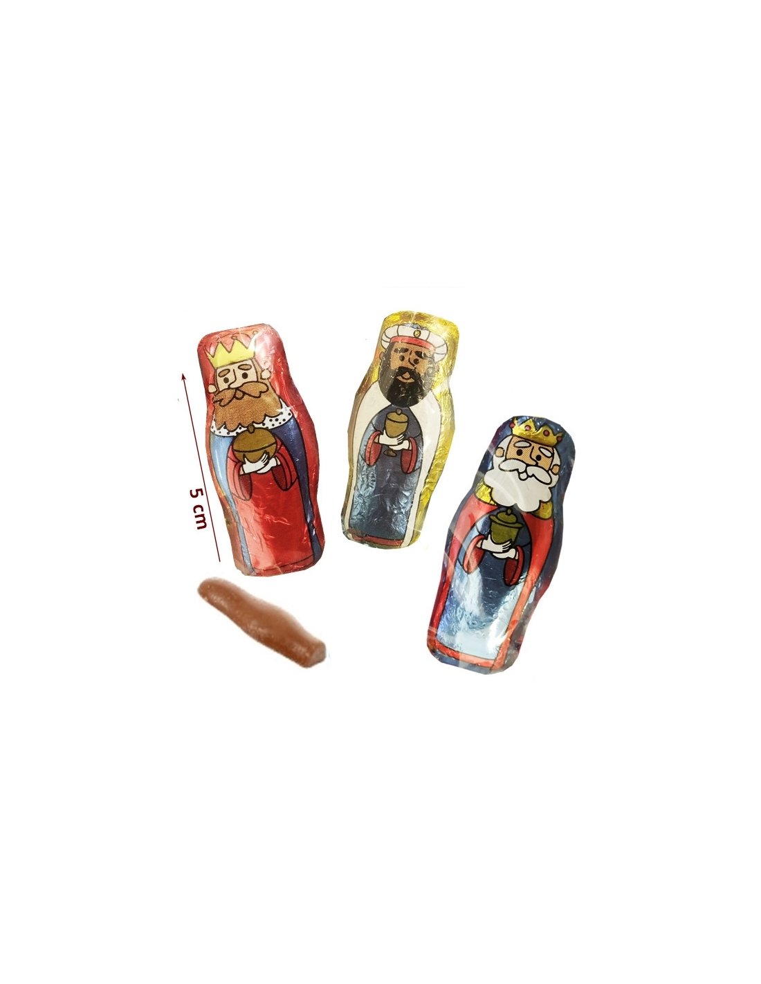 Mini Reyes Magos de Chocolate 1Kg (125uds aprox) son figuras pequeñas planas por detrás de 5cm de chocolate con leche envueltas con papel decorado de los Reyes Magos.