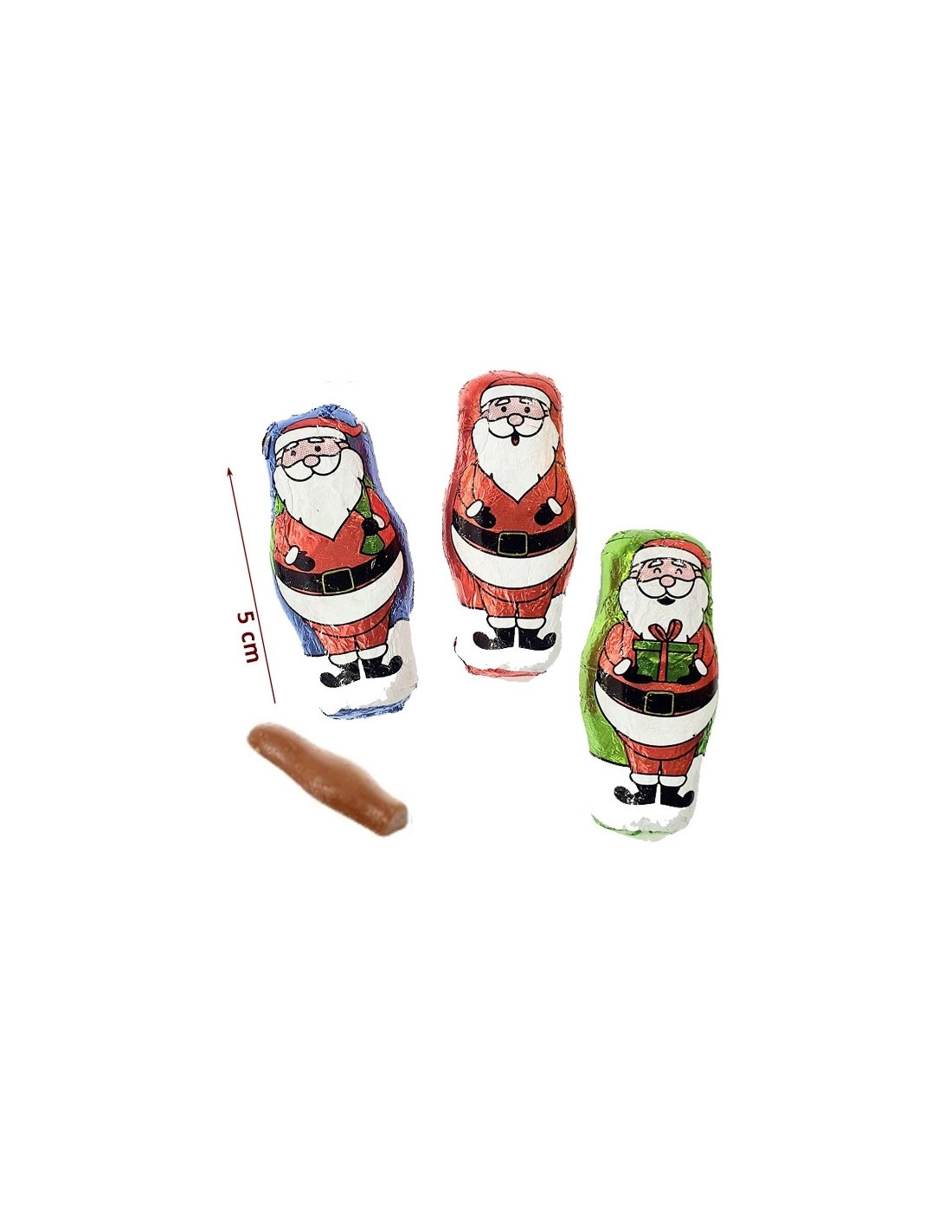 Mini Papa Noel de Chocolate 1Kg (125uds aprox) son figuras pequeñas planas por detrás de 5cm de chocolate con leche envueltas con papel decorado de Papa Noel.