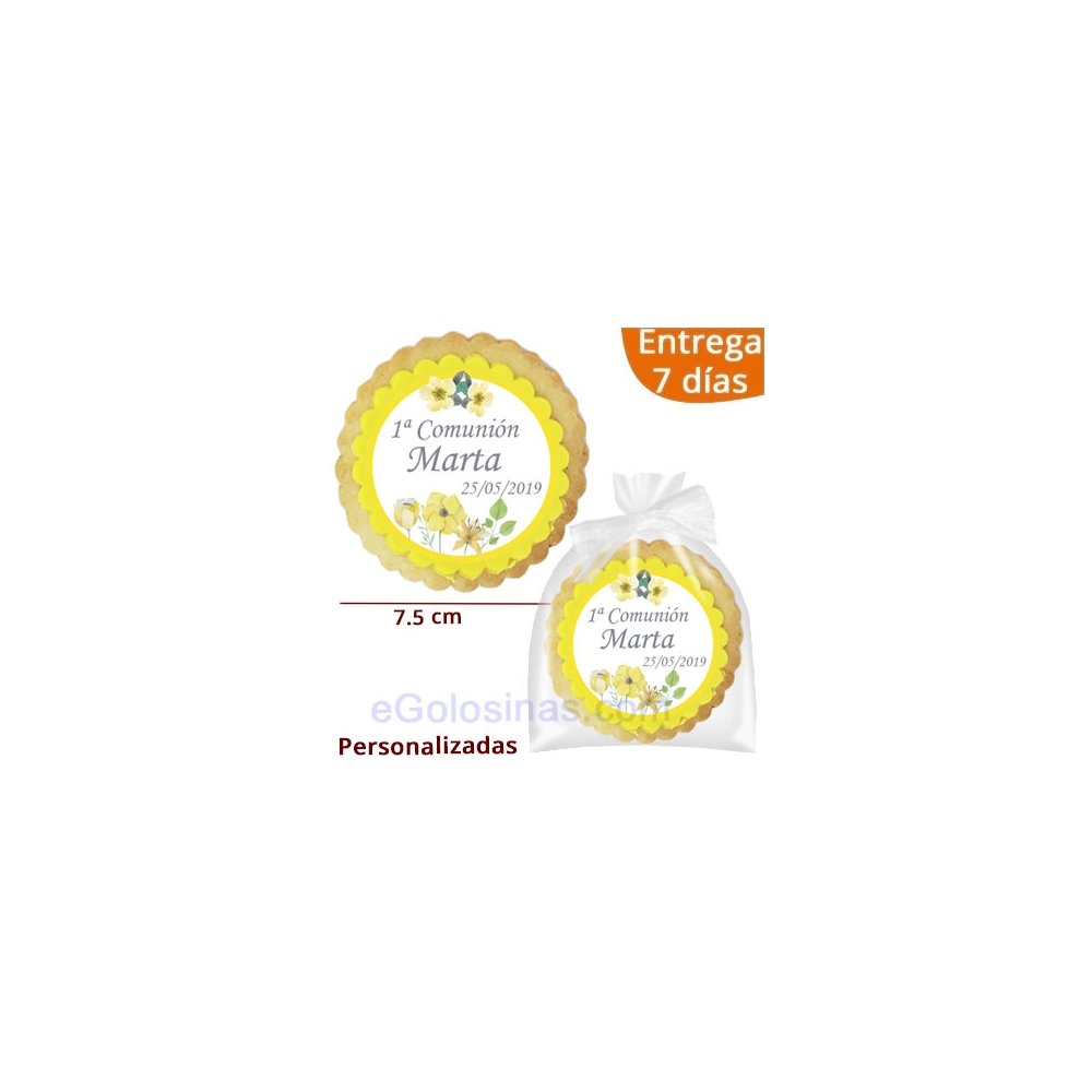 .GALLETAS REDONDAS AMARILLO COMUNION personalizada. Son galletas de mantequilla de 7.5cm de diámetro en una bolsa individual de celofán y cerradas con cinta organza blanca. Llevan una capa de fondant amarillo y una oblea comestible personalizada.