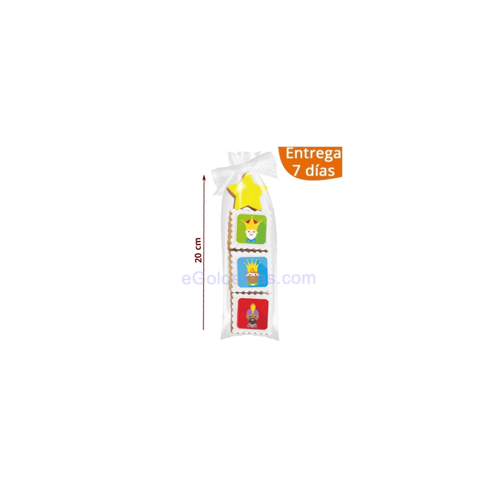 4 GALLETAS DECORADAS REYES MAGOS son 4 galletas artesanas de mantequilla: 3 galletas son cuadradas de 5x5cm con base de fondant blanco y una imagen de los diferentes Reyes Magos y la cuarta galleta es una bonita estrella.