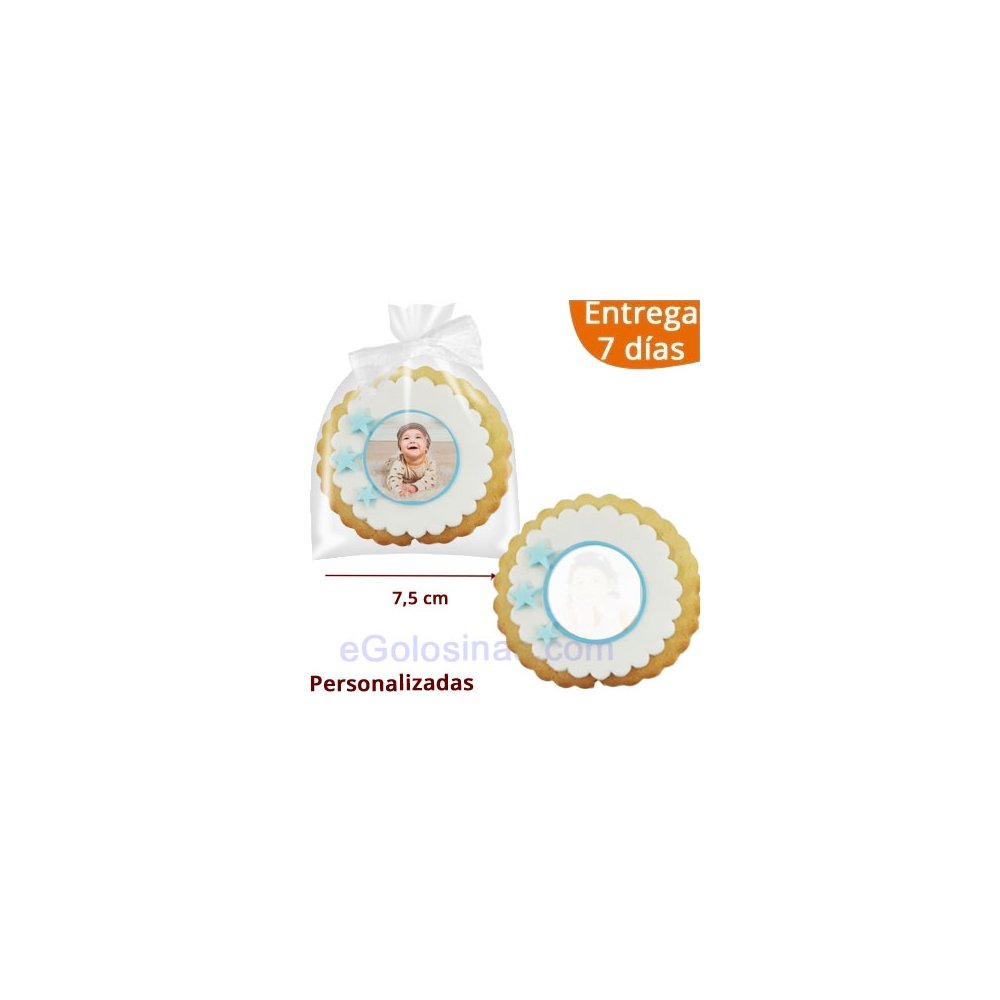 GALLETAS REDONDA ESTRELLAS con FOTO. Dispones de la opción entre base blanco y base azul. Miden 7.5cm de diámetro aprox y van en una bolsa de celofán transparente cerradas con cinta celofán blanca.