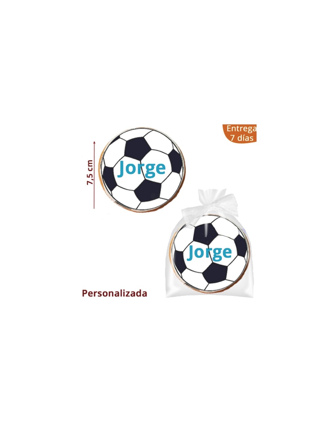 Galletas Balones de Futbol personalizadas en el nombre y color. El balón de Futbol mide 7.5cm de diámetro