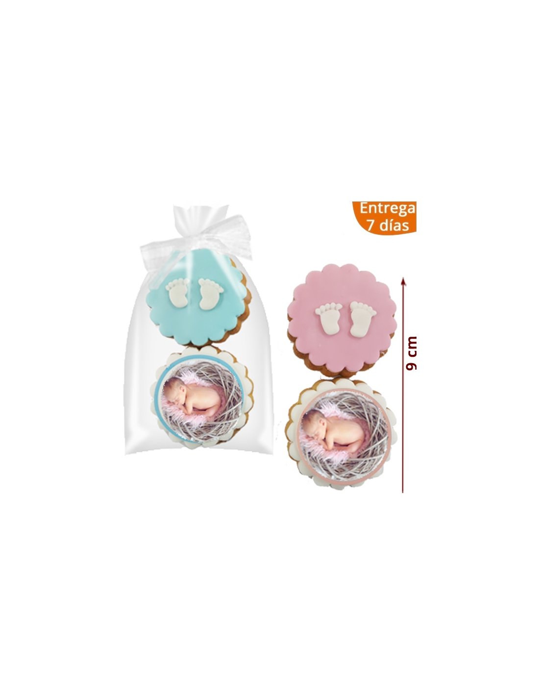 Son 2 GALLETAS BEBE BAUTIZO PIES con FOTO personalizada en una misma bolsa de celofán cerradas con cinta organza blanca. Sólo tienes que adjuntar la imagen más abajo