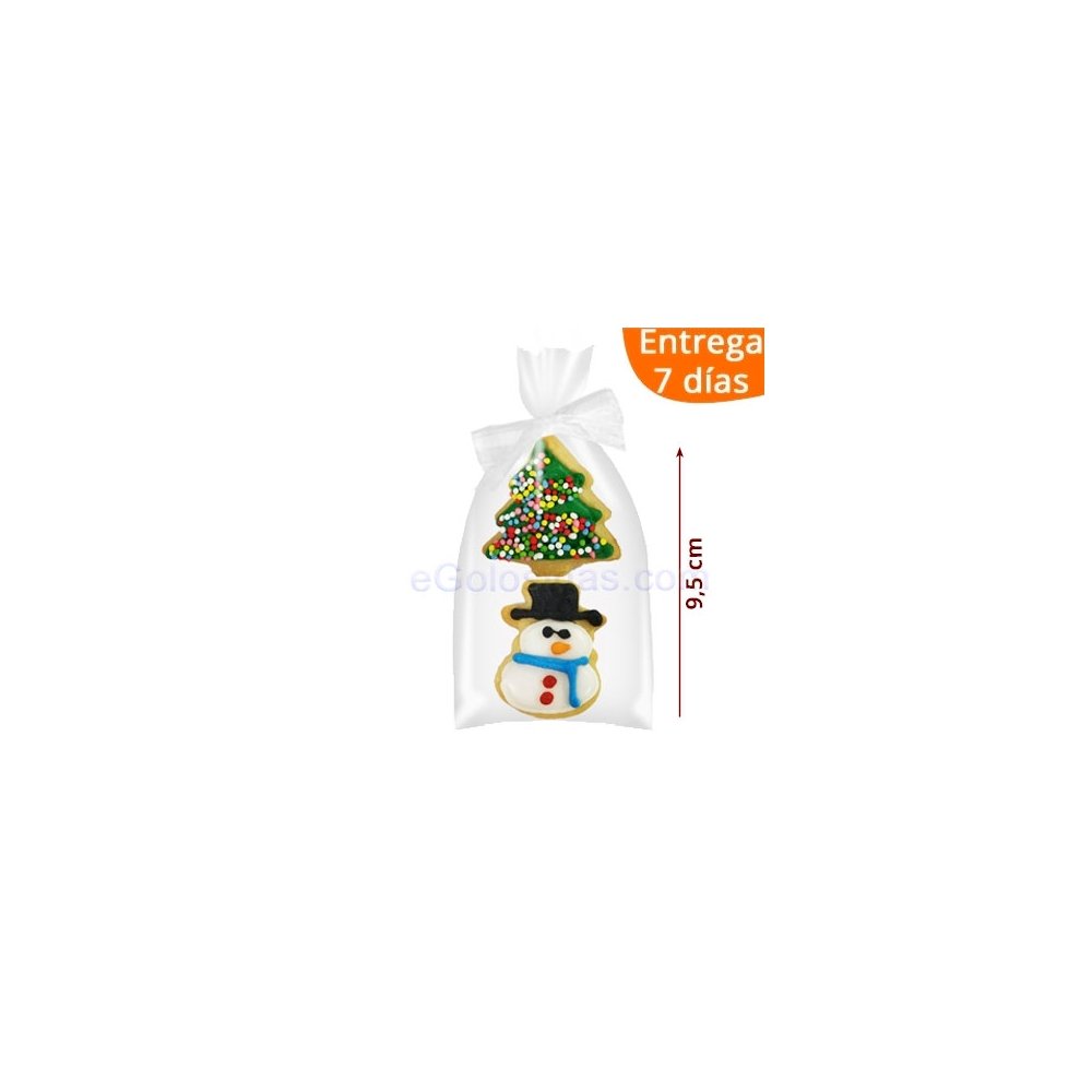 Es una bolsita de celofán con 2 galletas: una con forma de Árbol de Navidad decorado y la otra de Muñeco de Nieve El precio es la bolsita con las 2 galletas.