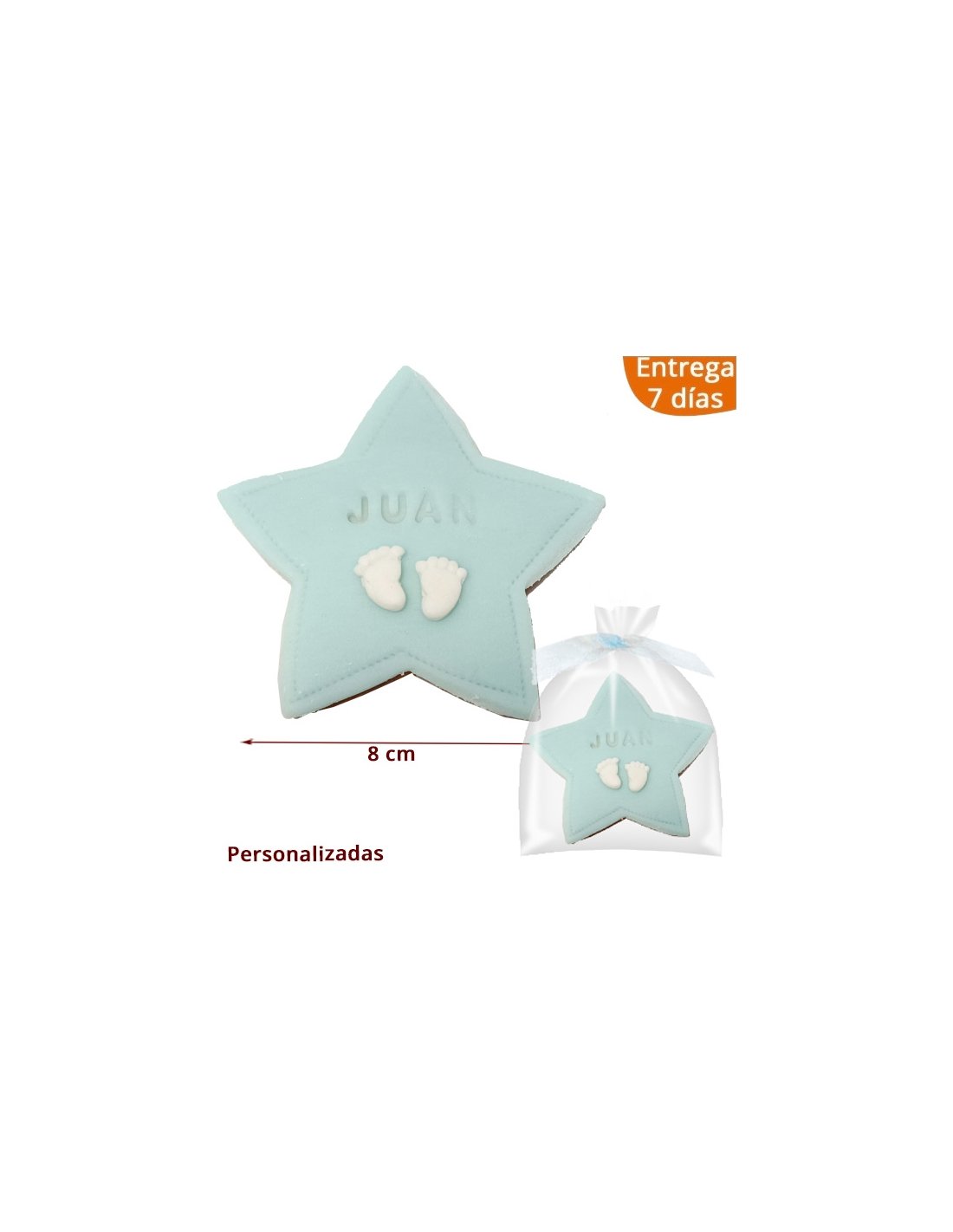 Son GALLETAS con forma de Estrella con pies de Bebé en fondant marcado con el NOMBRE personalizado. Sólo debes indicarlo más abajo y Guardar.