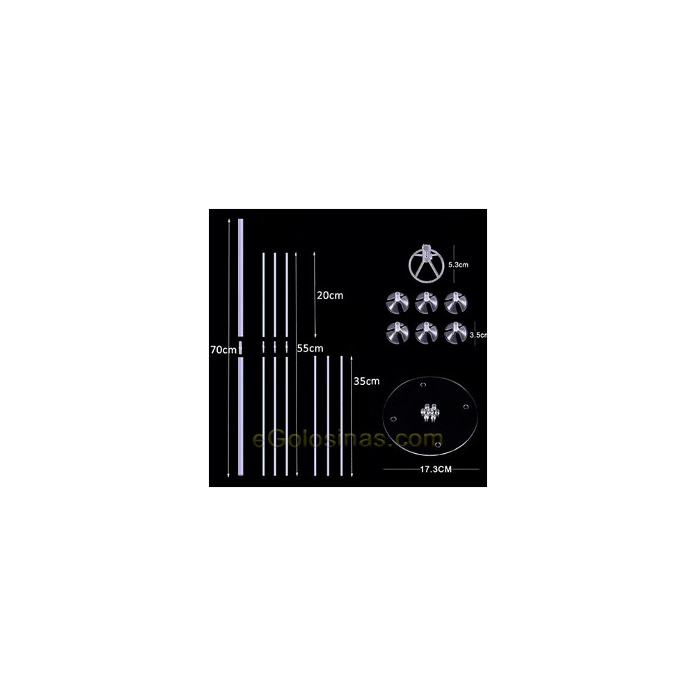 Contiene: Base, 3 palos de 20cm, 6 palos de 35cm, 4 juntas para alargar y los soportes de globos.