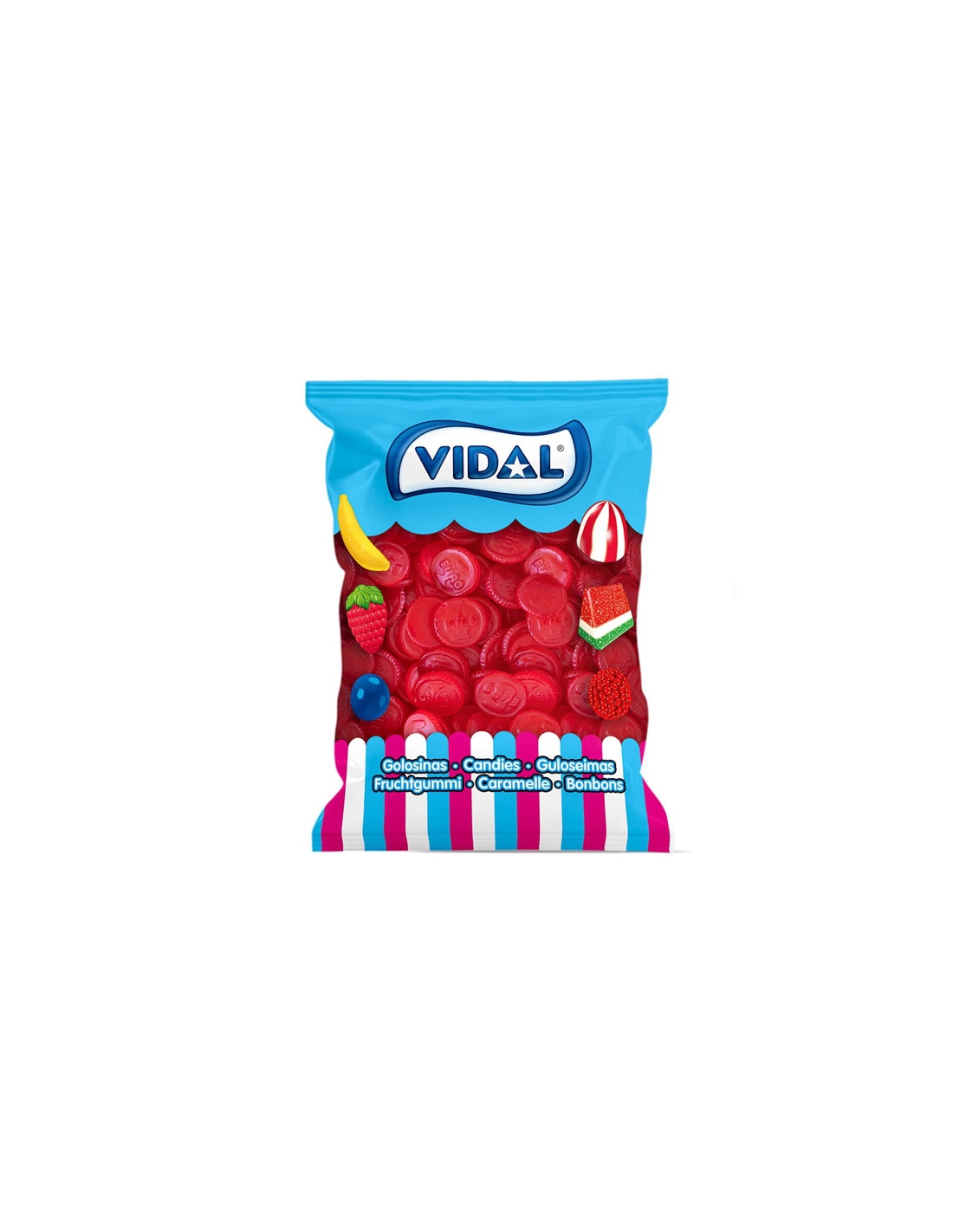 Comprar Chuches Monedas Euros Brillo de Fresa 250uds (1,5Kgs) Vidal Golosinas