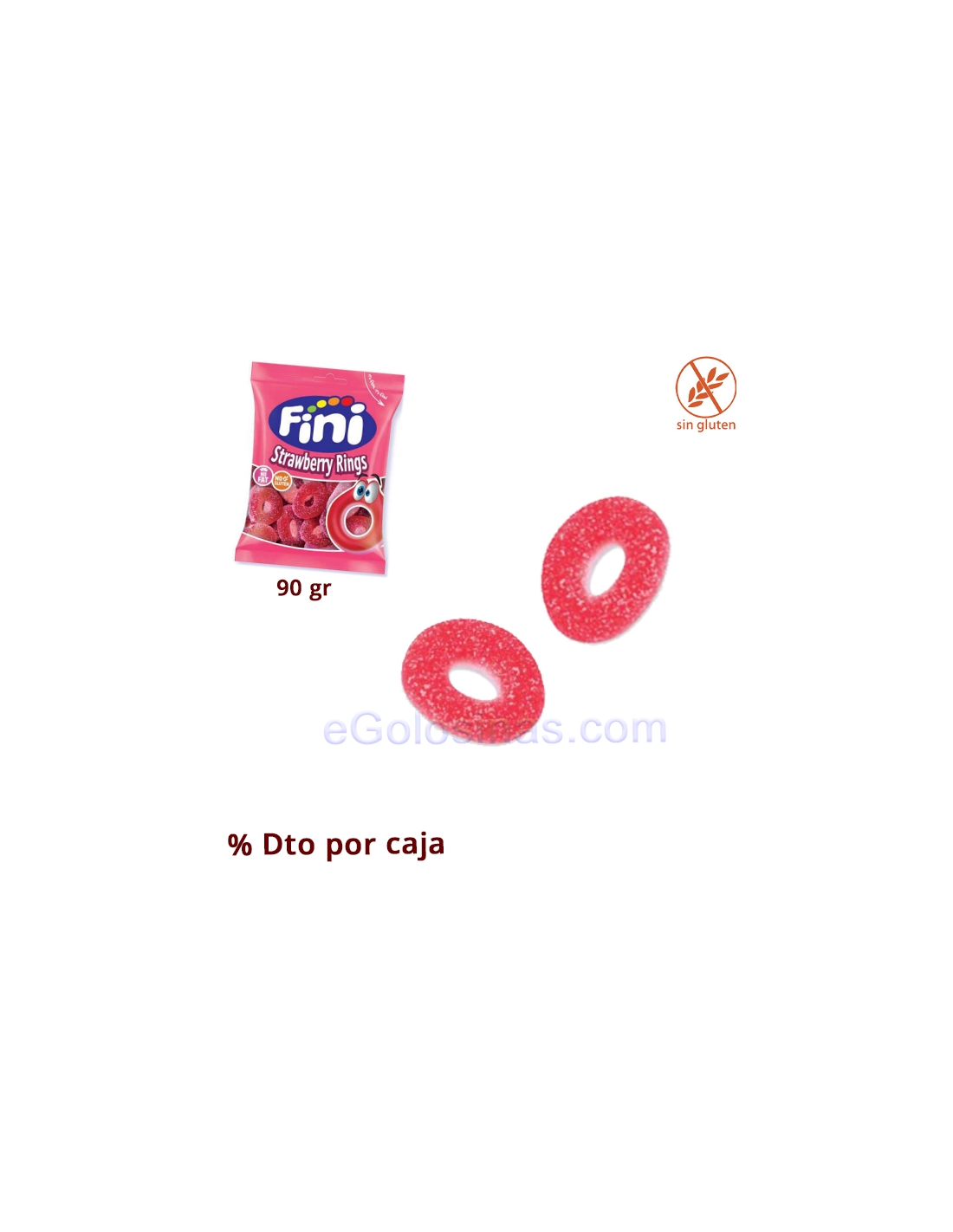 Aros Fresa Pica 12uds 90gr FINI son caramelos de goma de fresa ácida envueltos de pica con forma de aro
