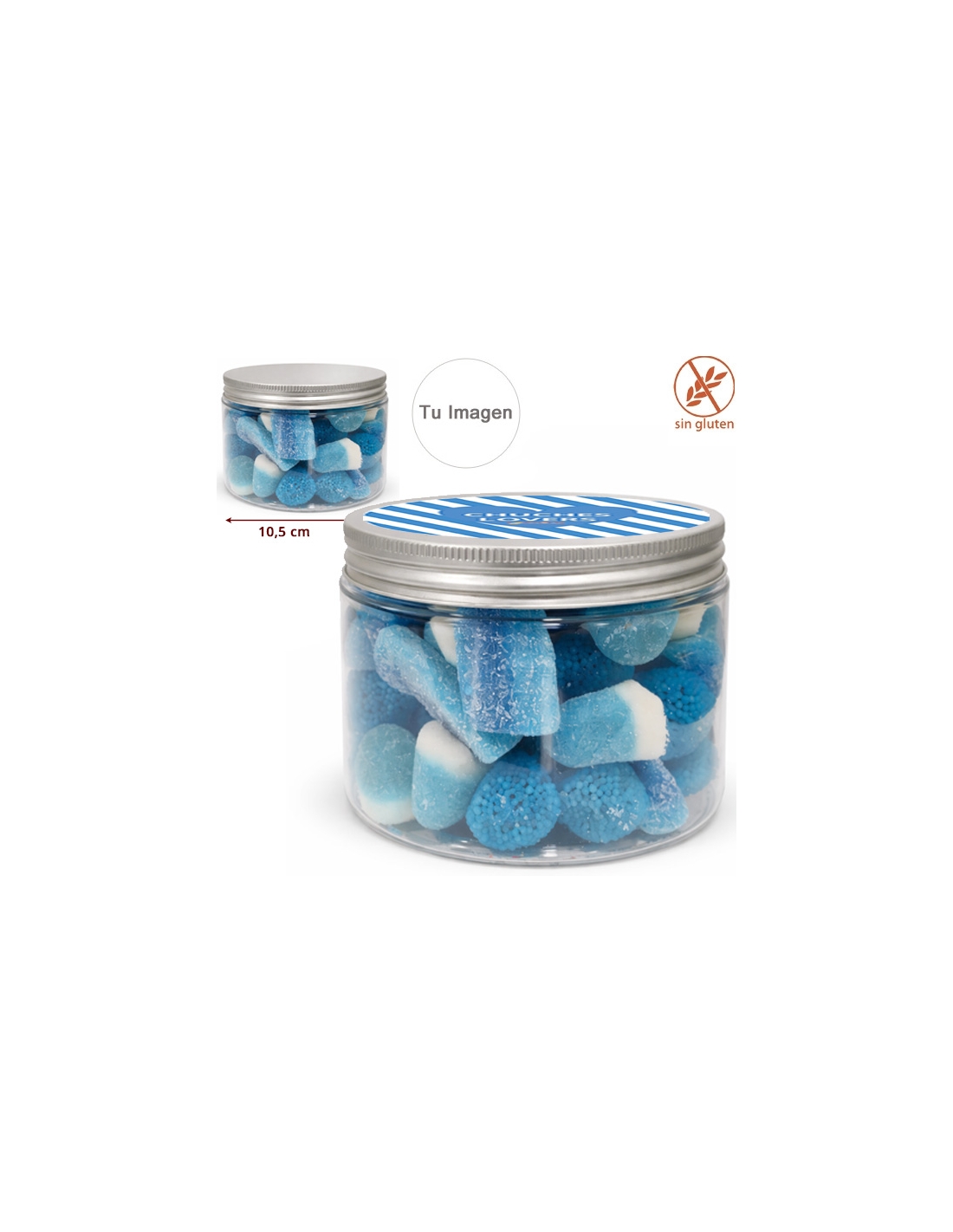 Puedes comprar tarros de chuches azules personalizados online en eGolosinas, con diferentes tamaños y entrega rápida a domicilio.