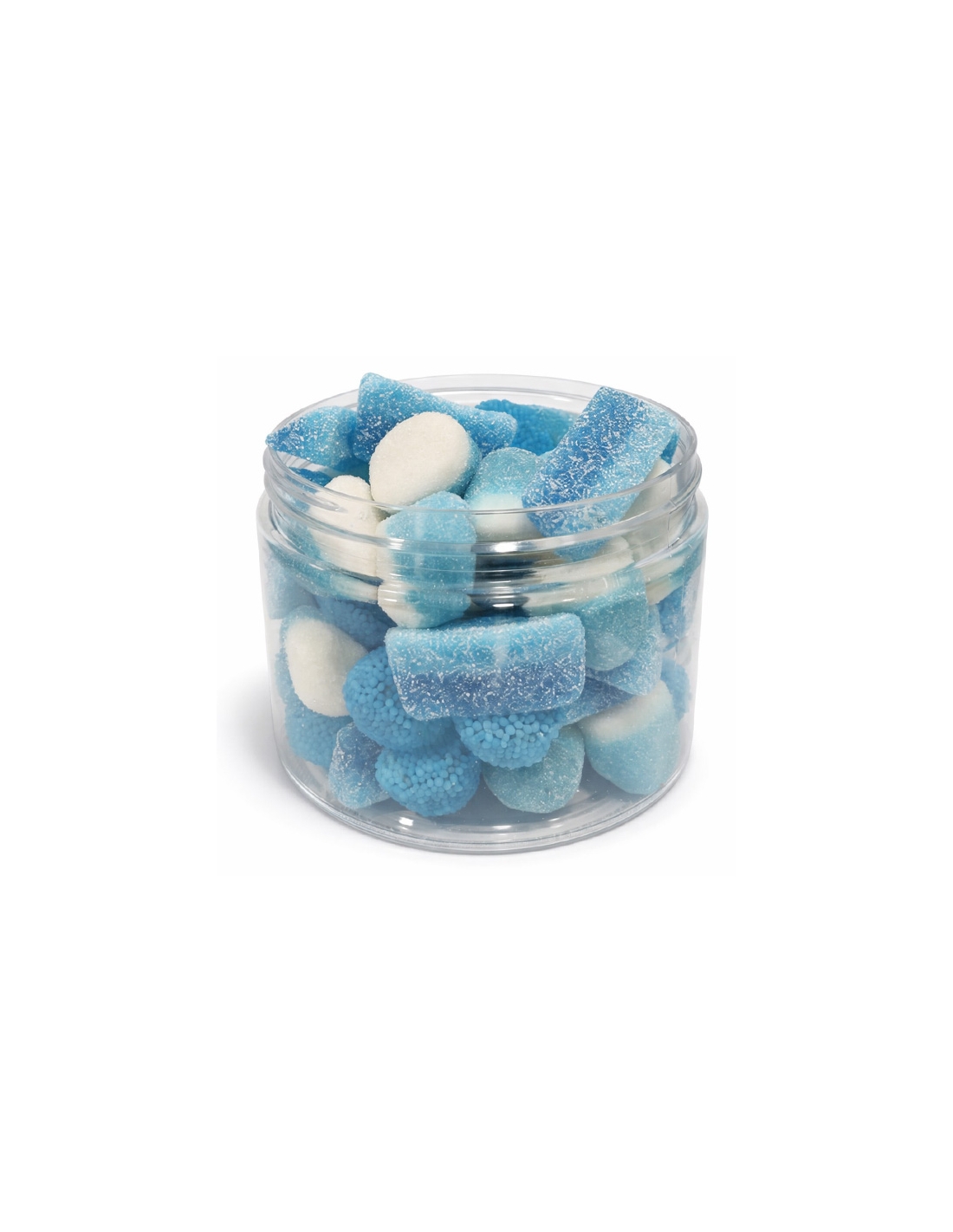 El bote transparente permite ver las golosinas azules surtidas, creando un efecto visual muy atractivo.