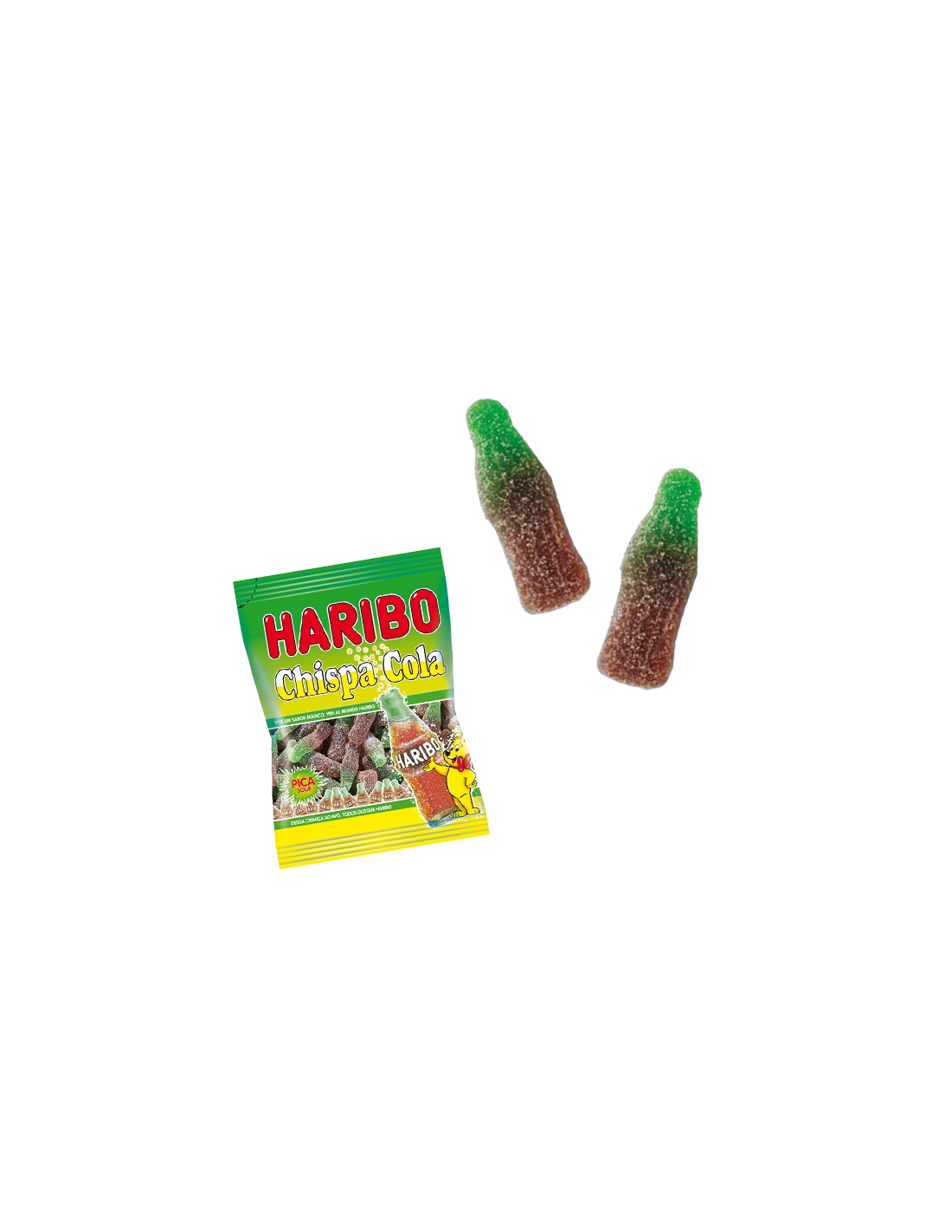 CHISPA COLA de HARIBO 18 Bolsitas de 100gr son gomas de Botellas Cola con pica en bolsitas de menos de 100gr. Se venden 18 bolsitas.