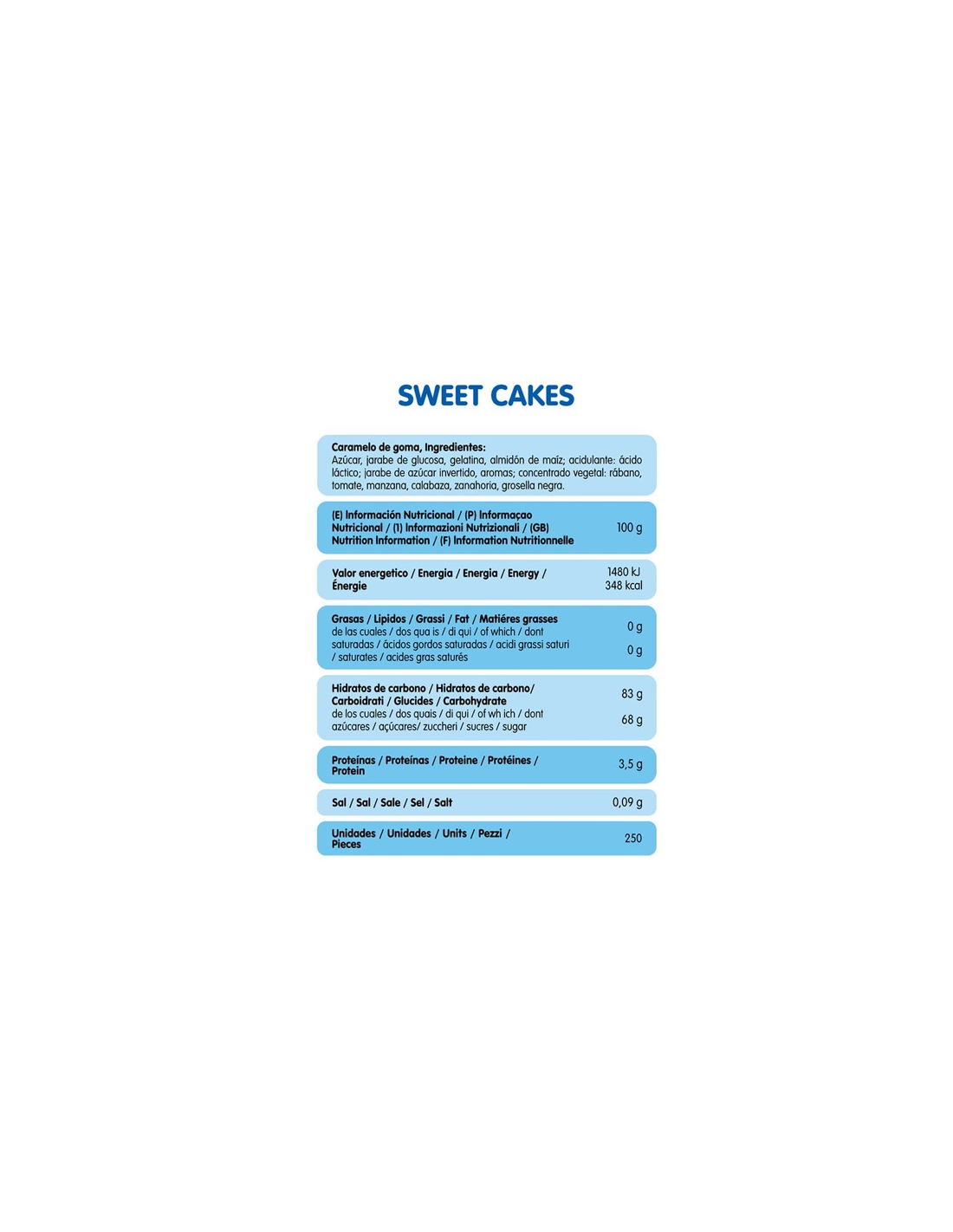 Ingredientes: azúcar, jarabe de glucosa, gelatina, almidón de maíz, acidulante: ácido láctico; jarabe de azúcar invertido, aromas, concentrado vegetal: rábano, tomate, manzana, calabaza, zanahoria, grosella negra.
