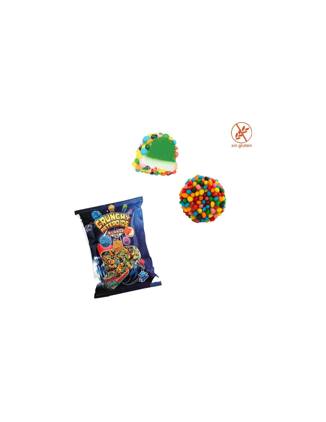 Moras multicolor ácidas Crujientes Asteroides 100gr 14 Bolsitas g Burmar Golosinas es una combinación de super crujientes con granos ácidos y goma blanda por dentro.