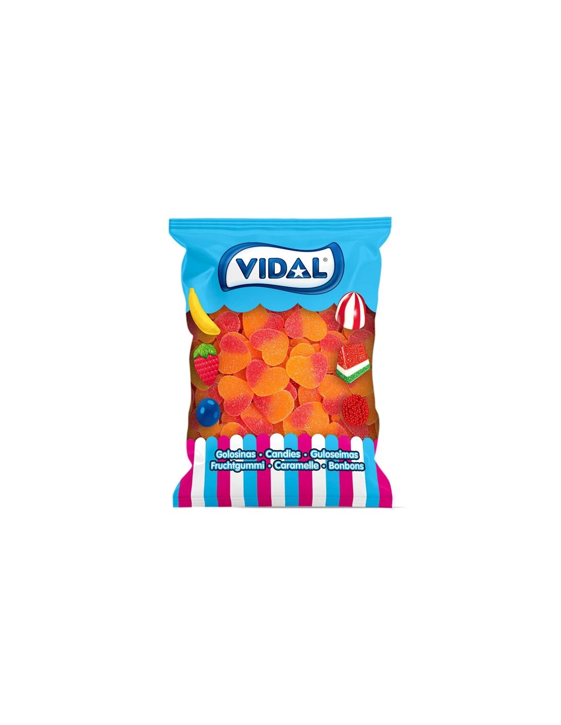 Los CORAZONES MELOCOTON de VIDAL es una goma con forma de corazón de fresa y melocotón recubierta de azúcar. Se venden en bolsas de 250uds. SIn GLuten