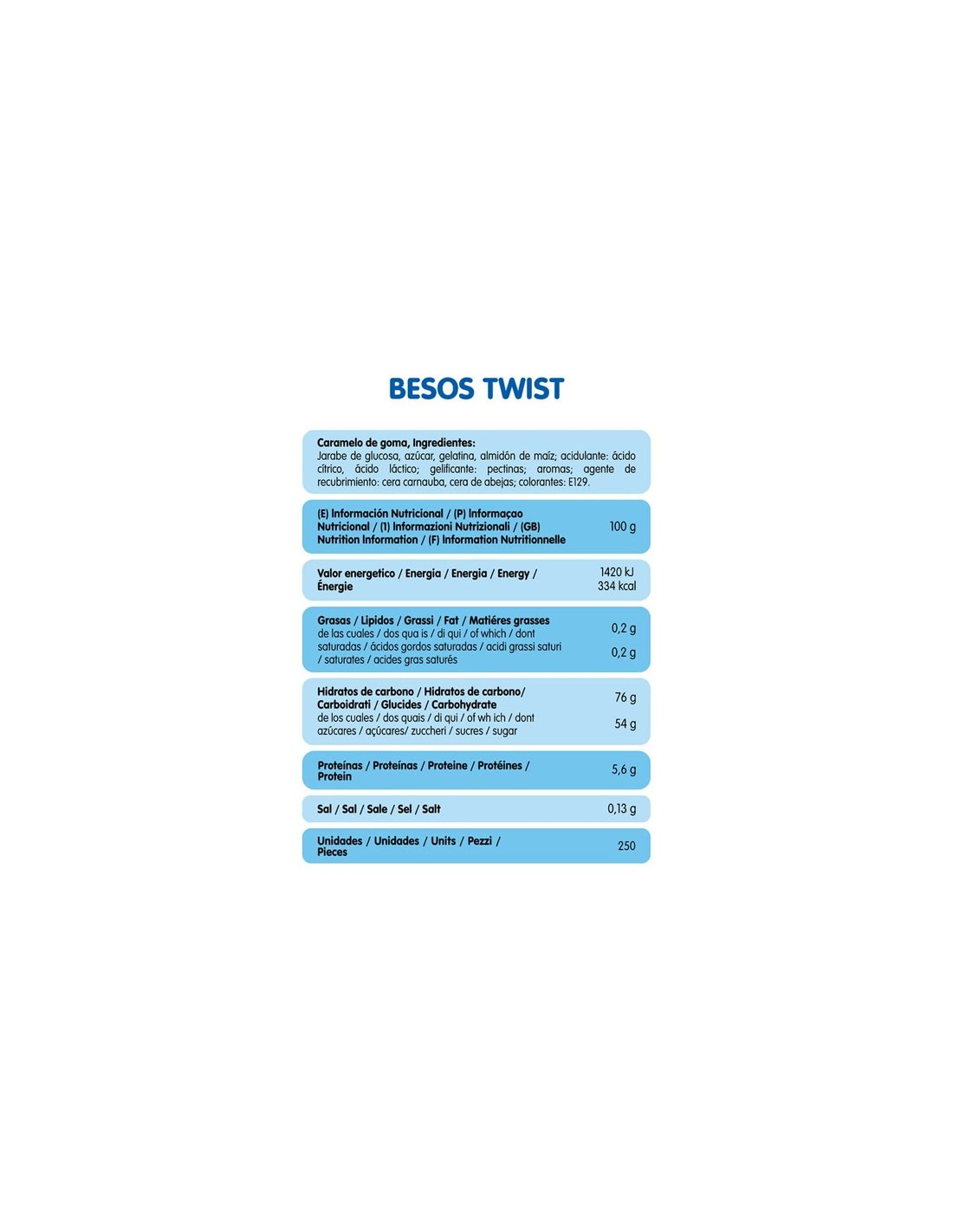 Ingredientes: jarabe de glucosa, azúcar, gelatina, almidón de maíz; acidulante: ácido cítrico, ácido láctico; gelificante: pectinas; aromas, aceites vegetales (palma); agente de recubrimiento: cera carnauba, cera de abejas; colorantes: E129.