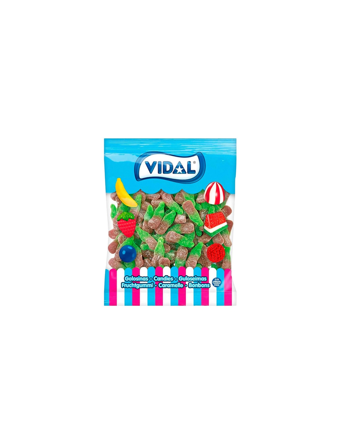 Chuches Botella Cola Verde 250uds Vidal Golosinas BOTELLA COLA son botellas de cola de goma envueltas de azúcar. Se venden en bolsas de 250uds. Sin Gluten