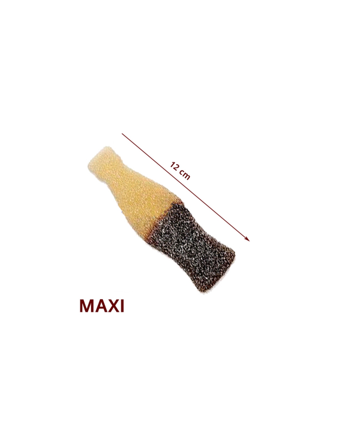 MAXI BOTELLA COLA PICA son botellas de cola de goma recubiertas de pica de tamaño XXL de 12 cm aprox de largo. Se venden en bolsas de 1Kg.